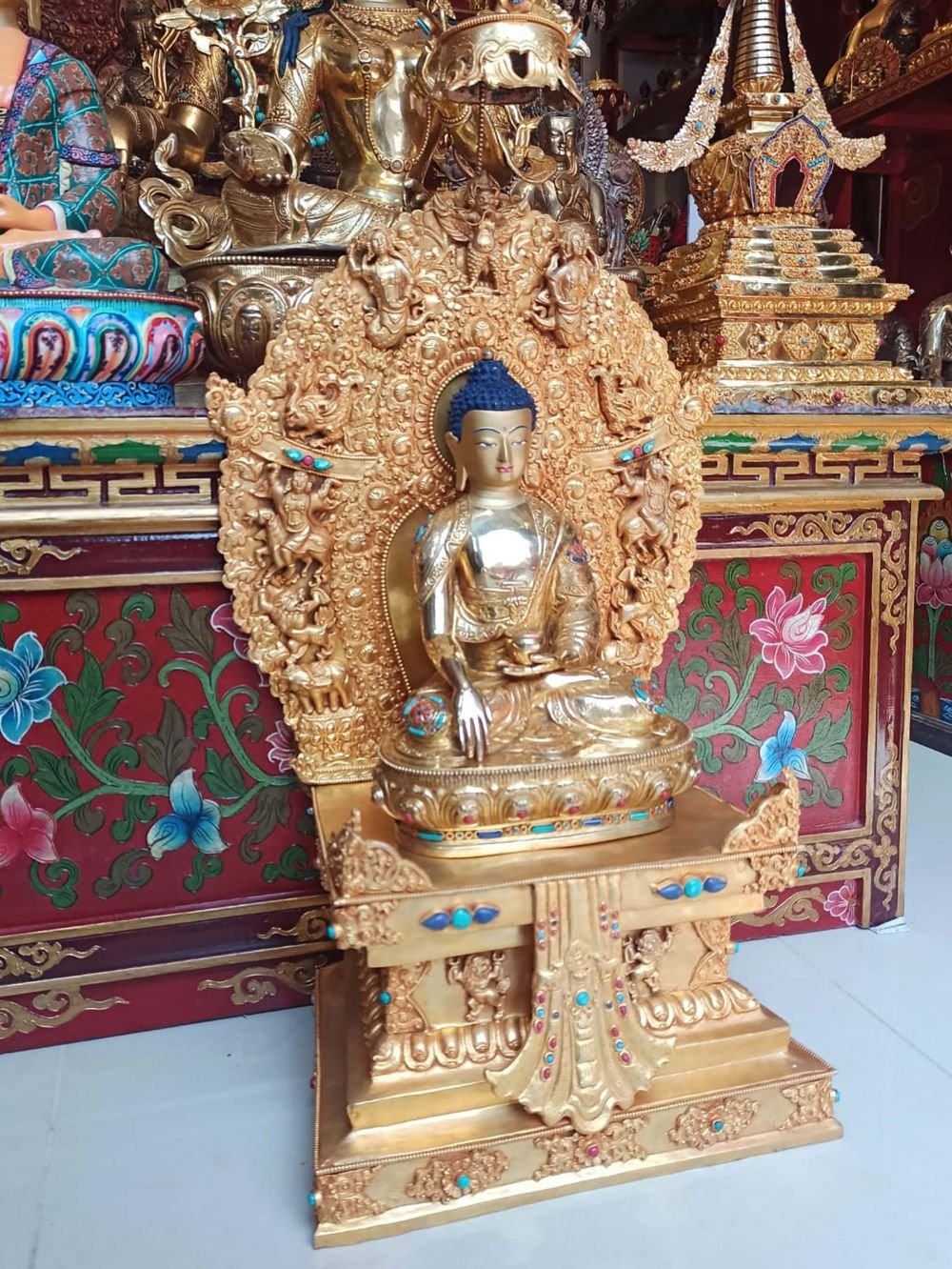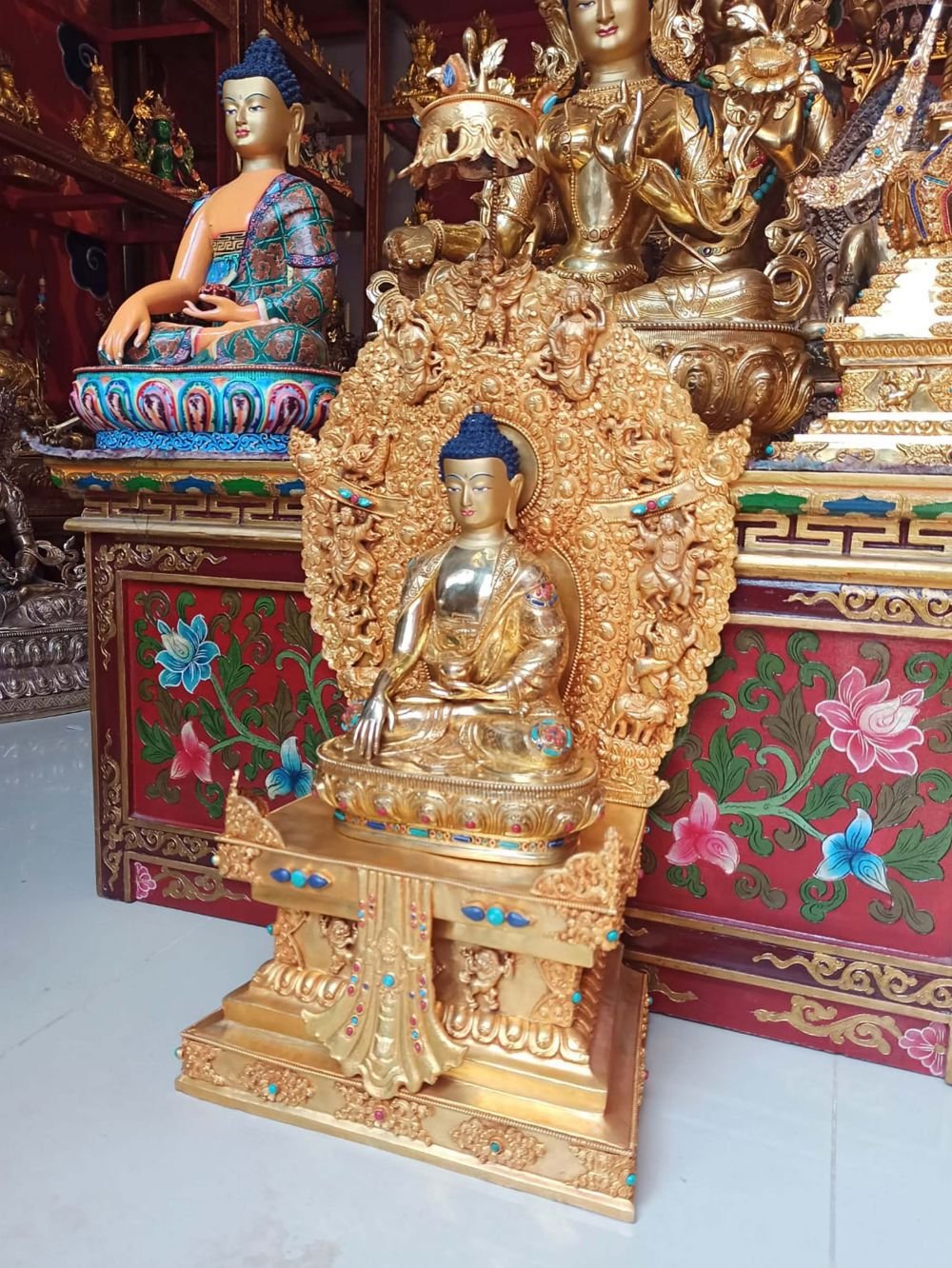 This Shakyamuni Buddha is finished with full gold plating. also known as mercury gold plating or fire gold plating. This traditional technique involves the application of a genuine layer of gold onto the Shakyamuni Buddha. Referred to as mercury gold plating, it is considered the correct and authentic form of gold plating in Nepal. Despite being more expensive than electroplating, this traditional mercury gold plating is gaining popularity again in Nepal. People are drawn to its authenticity, longevity, and the unmatched beauty it brings to the Shakyamuni Buddha. The resurgence of interest in this traditional form of gold plating reflects a growing appreciation for the craftsmanship and cultural heritage of Nepal Read More
