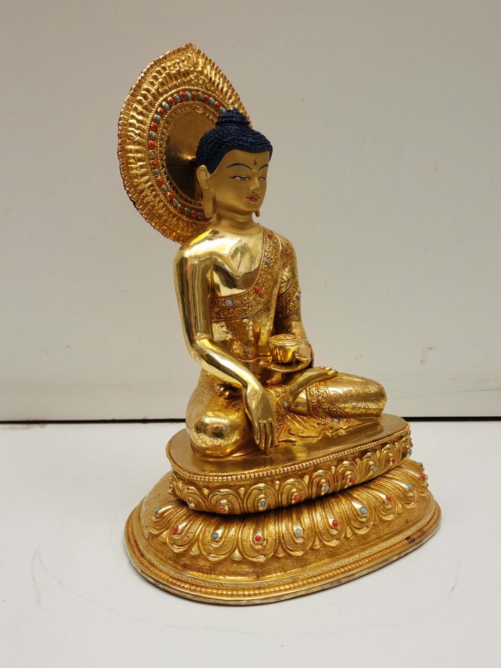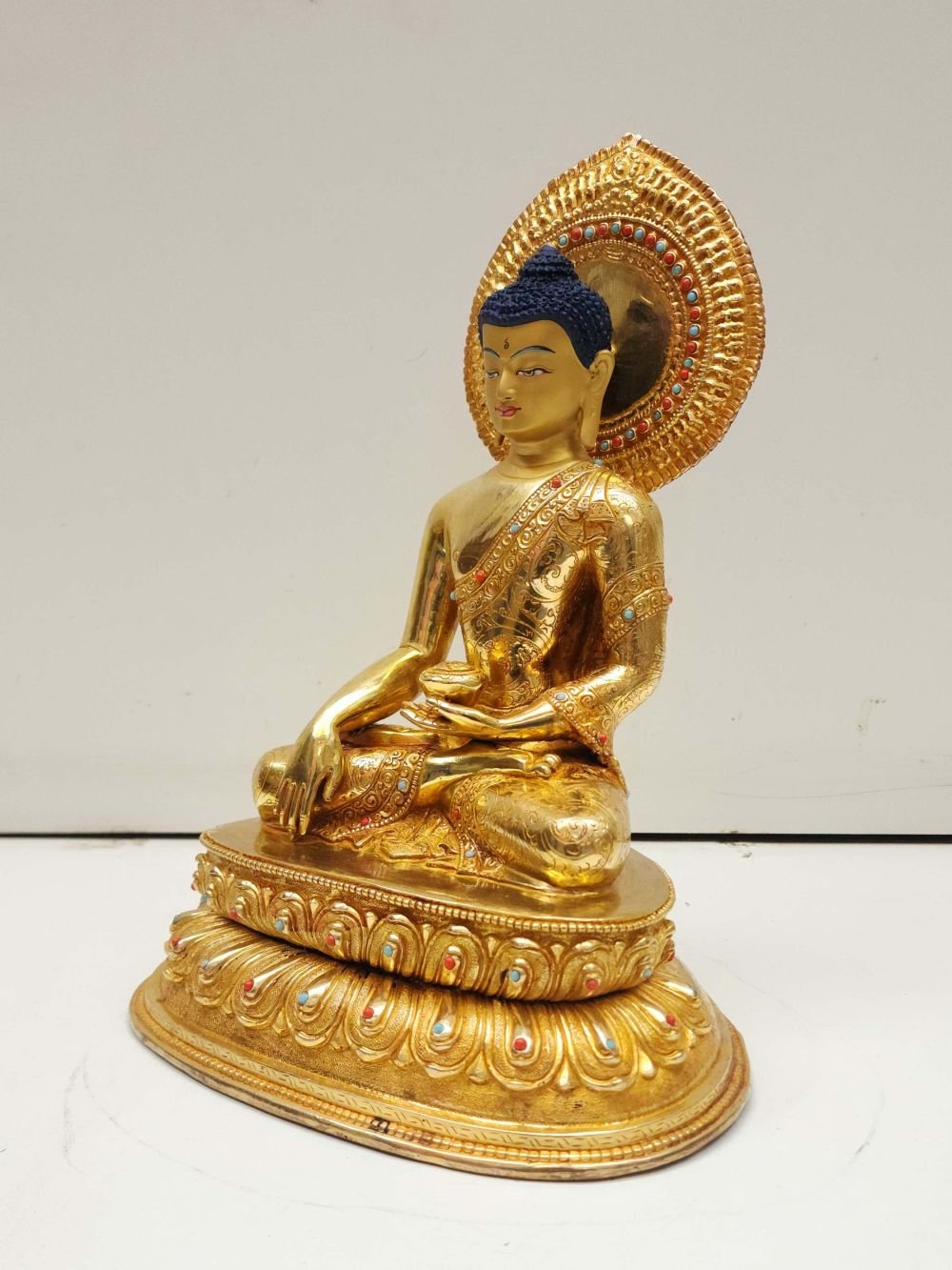 Buddhist Handmade Statue of Shakyamuni Buddha, Full Fire Gold Plated, Face Painted, Stone Setting , The Enlightened One and Teacher of Humanity