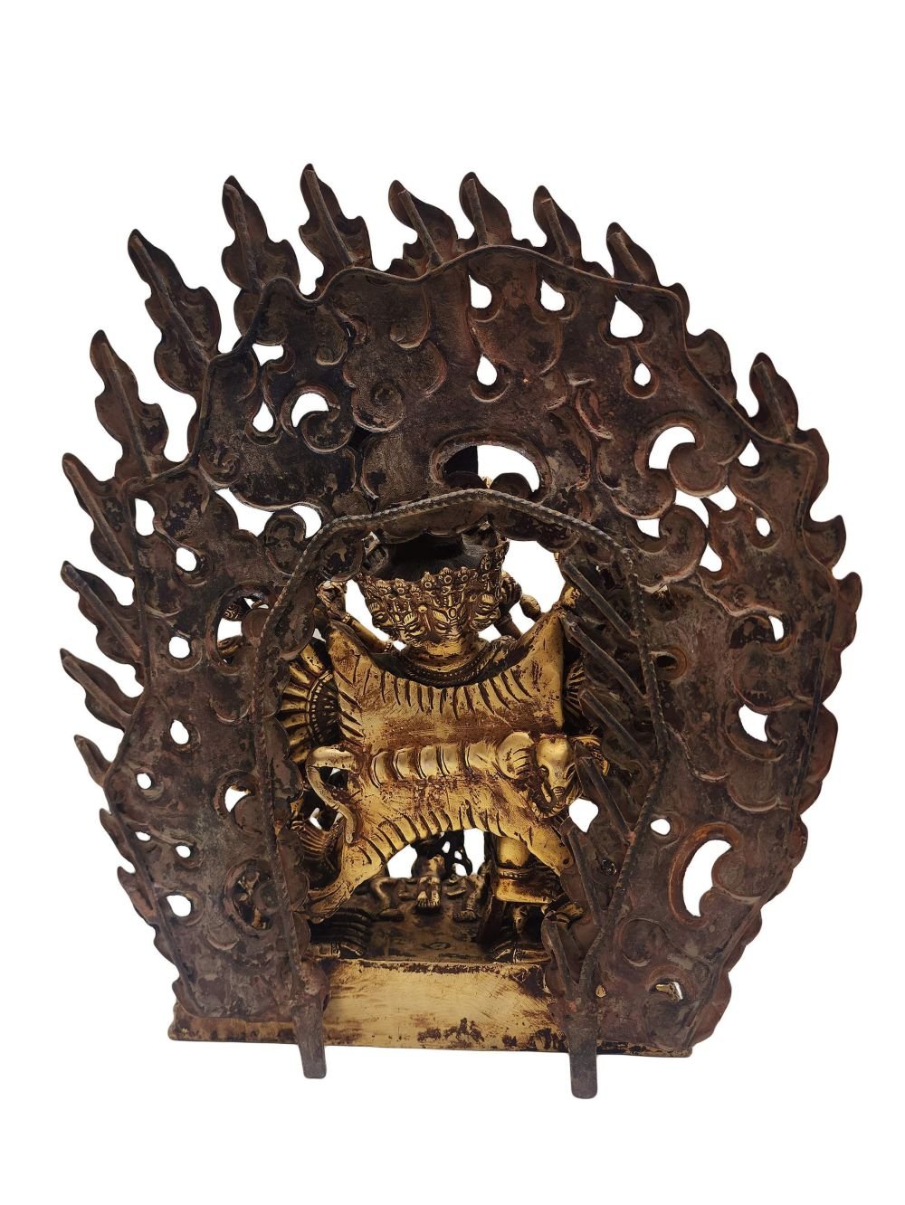 This Yamantaka is finished with full gold plating. also known as mercury gold plating or fire gold plating. This traditional technique involves the application of a genuine layer of gold onto the Yamantaka. Referred to as mercury gold plating, it is considered the correct and authentic form of gold plating in Nepal. Despite being more expensive than electroplating, this traditional mercury gold plating is gaining popularity again in Nepal. People are drawn to its authenticity, longevity, and the unmatched beauty it brings to the Yamantaka. The resurgence of interest in this traditional form of gold plating reflects a growing appreciation for the craftsmanship and cultural heritage of Nepal Read More