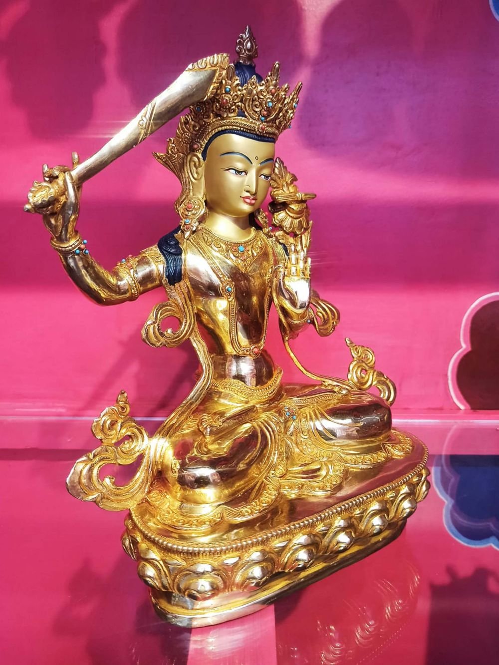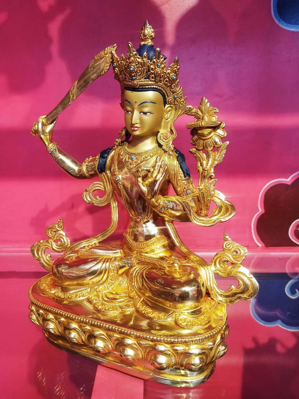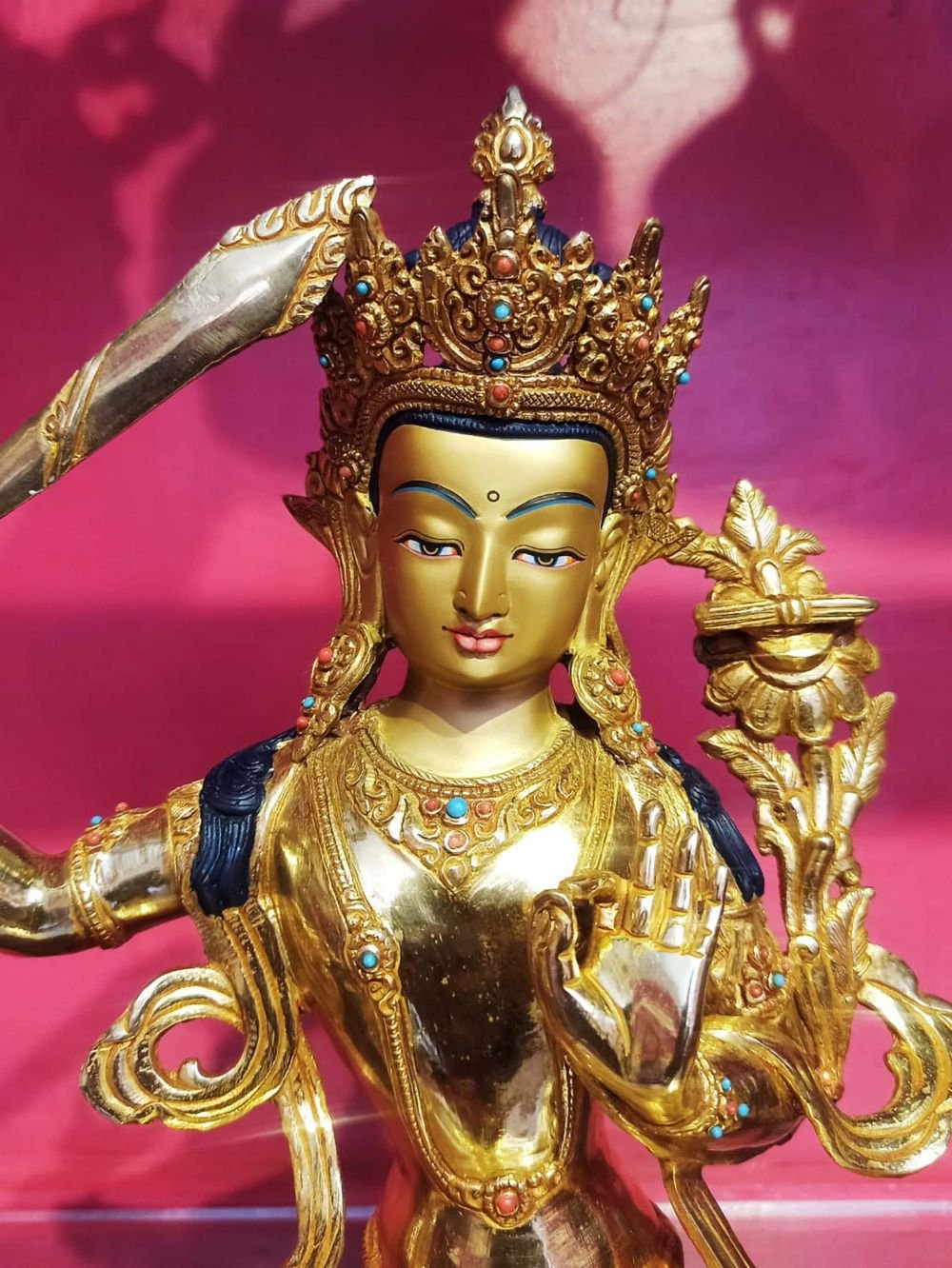Manjushri Statue, Buddhist Handmade Statue, Face Painted, Gold Plated, Stone Setting , Wisdom Buddha, cutting through ignorance with the sword of insight