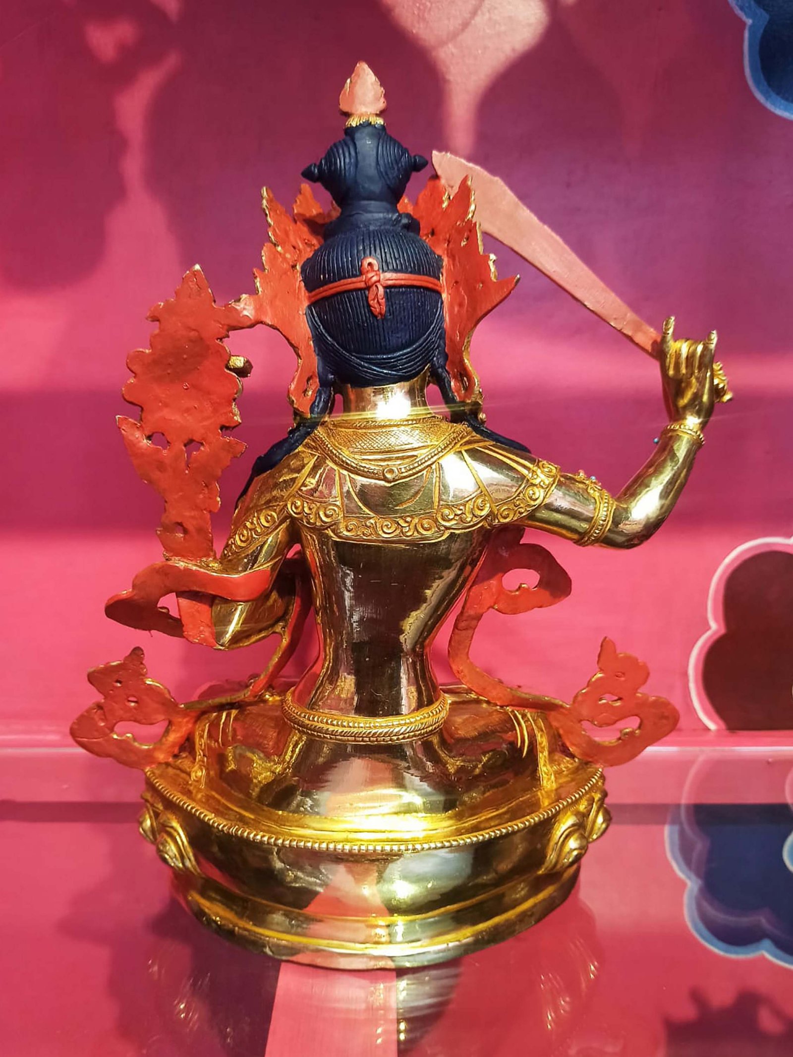 This Manjushri is finished with full gold plating. also known as mercury gold plating or fire gold plating. This traditional technique involves the application of a genuine layer of gold onto the Manjushri. Referred to as mercury gold plating, it is considered the correct and authentic form of gold plating in Nepal. Despite being more expensive than electroplating, this traditional mercury gold plating is gaining popularity again in Nepal. People are drawn to its authenticity, longevity, and the unmatched beauty it brings to the Manjushri. The resurgence of interest in this traditional form of gold plating reflects a growing appreciation for the craftsmanship and cultural heritage of Nepal Read More