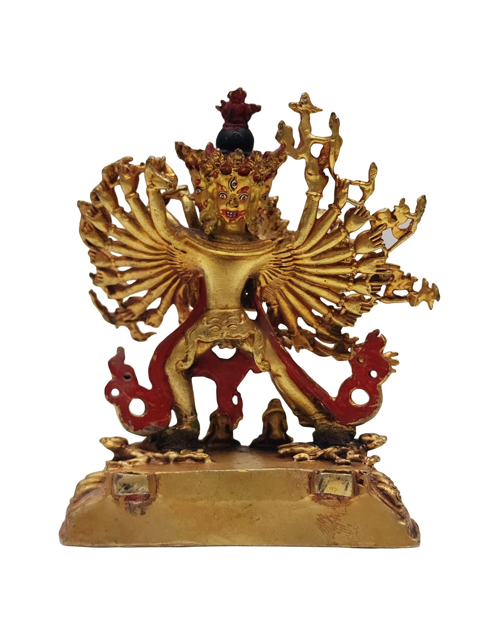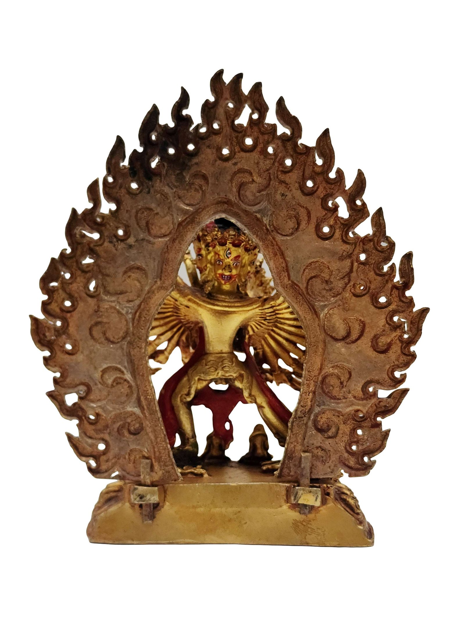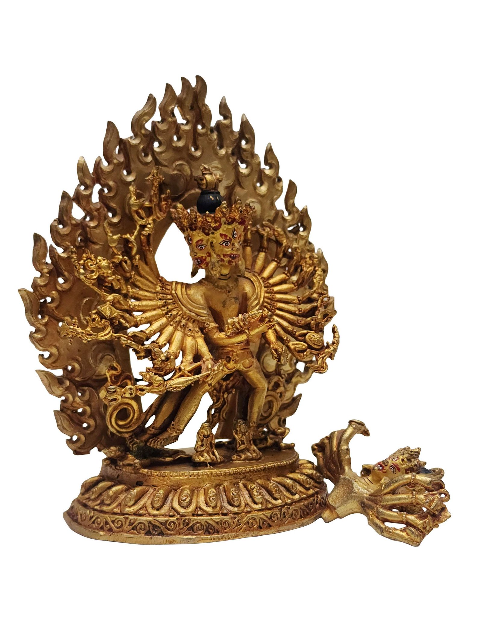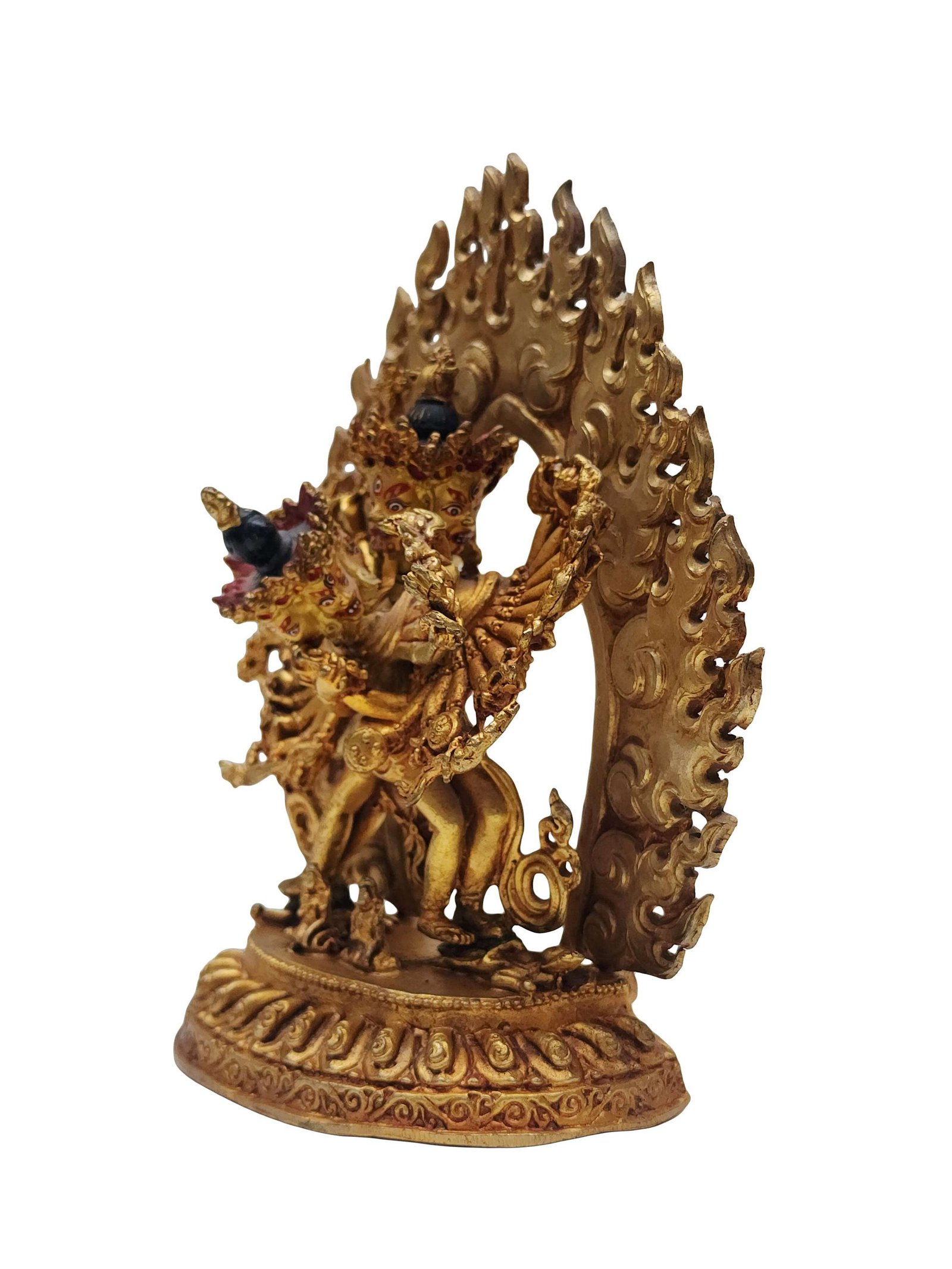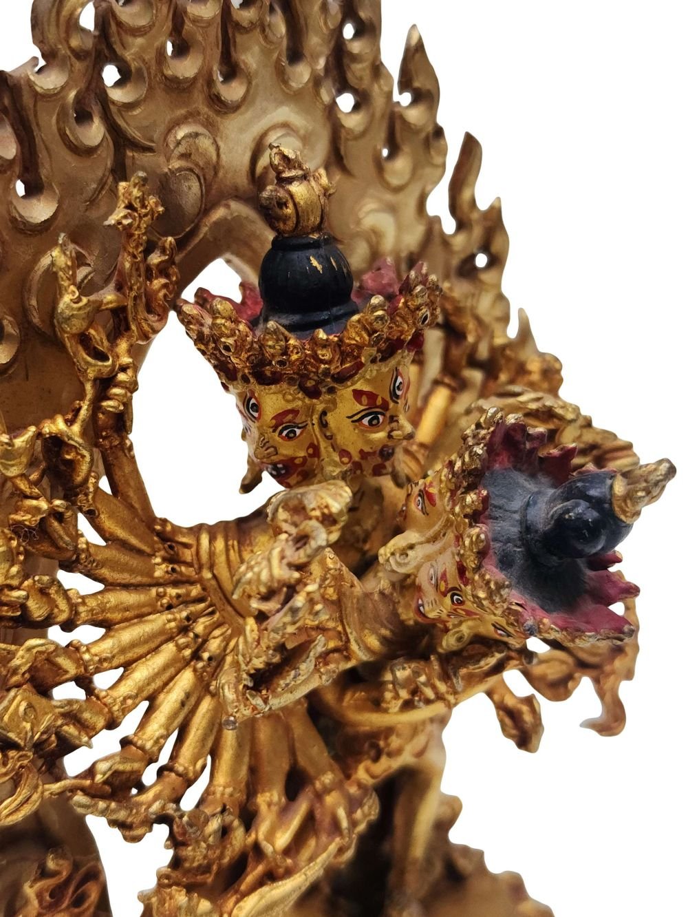 The face of Kalachakra is painted with gold to enhance its significant features, particularly the eyes, and lips. This detailed painting is essential as it brings forth the crucial attributes of the expression of eyes and lips that metal carving alone cannot capture.