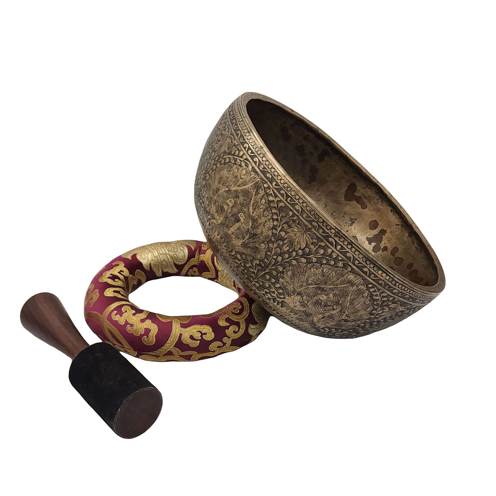 Rare Find, Buddhist Real Antique Hand Beaten Bangladeshi Jambati Singing Bowl, Carved Design, Beautiful Sound Quality, Antique, Select Accessories |