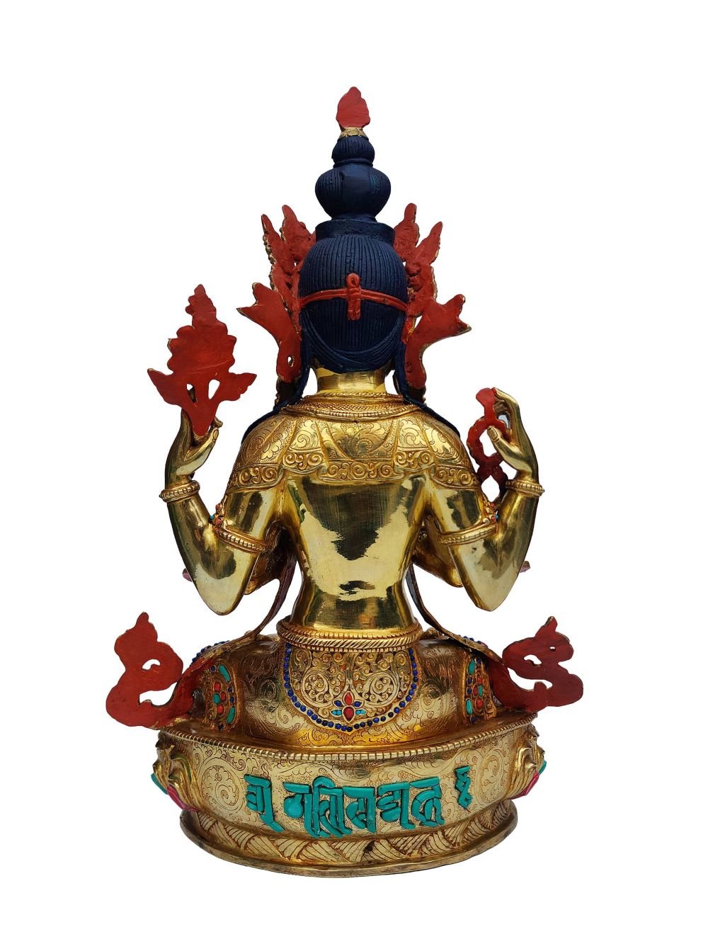 The Chenrezig is adorned with an exquisite array of semi-precious stones, including turquoise, coral, and lapis lazuli. These stones are carefully selected and meticulously placed on the Chenrezig's surface, adding a touch of opulence and enhancing its overall beauty. Each stone is thoughtfully positioned using a high-quality adhesive, ensuring secure and long-lasting attachment. The vibrant colors and unique patterns of the stones create a captivating contrast against the backdrop of the Chenrezig, elevating its visual appeal and making it truly eye-catching. Read More