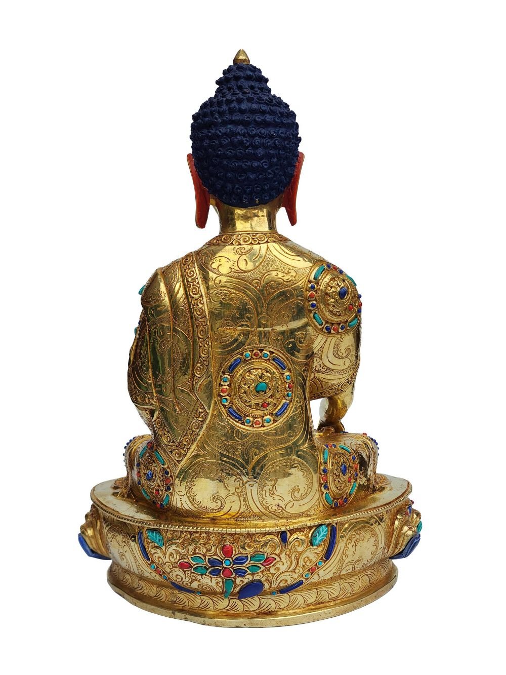Buddhist Handmade Statue of Shakyamuni Buddha, Face Painted, Gold Plated, Stone Setting , The Enlightened One and Teacher of Humanity