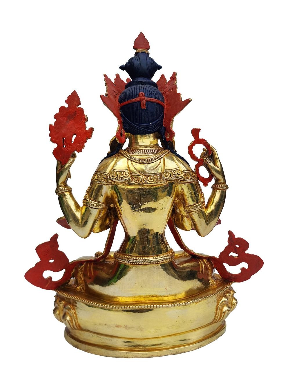 This Chenrezig is finished with full gold plating. also known as mercury gold plating or fire gold plating. This traditional technique involves the application of a genuine layer of gold onto the Chenrezig. Referred to as mercury gold plating, it is considered the correct and authentic form of gold plating in Nepal. Despite being more expensive than electroplating, this traditional mercury gold plating is gaining popularity again in Nepal. People are drawn to its authenticity, longevity, and the unmatched beauty it brings to the Chenrezig. The resurgence of interest in this traditional form of gold plating reflects a growing appreciation for the craftsmanship and cultural heritage of Nepal Read More