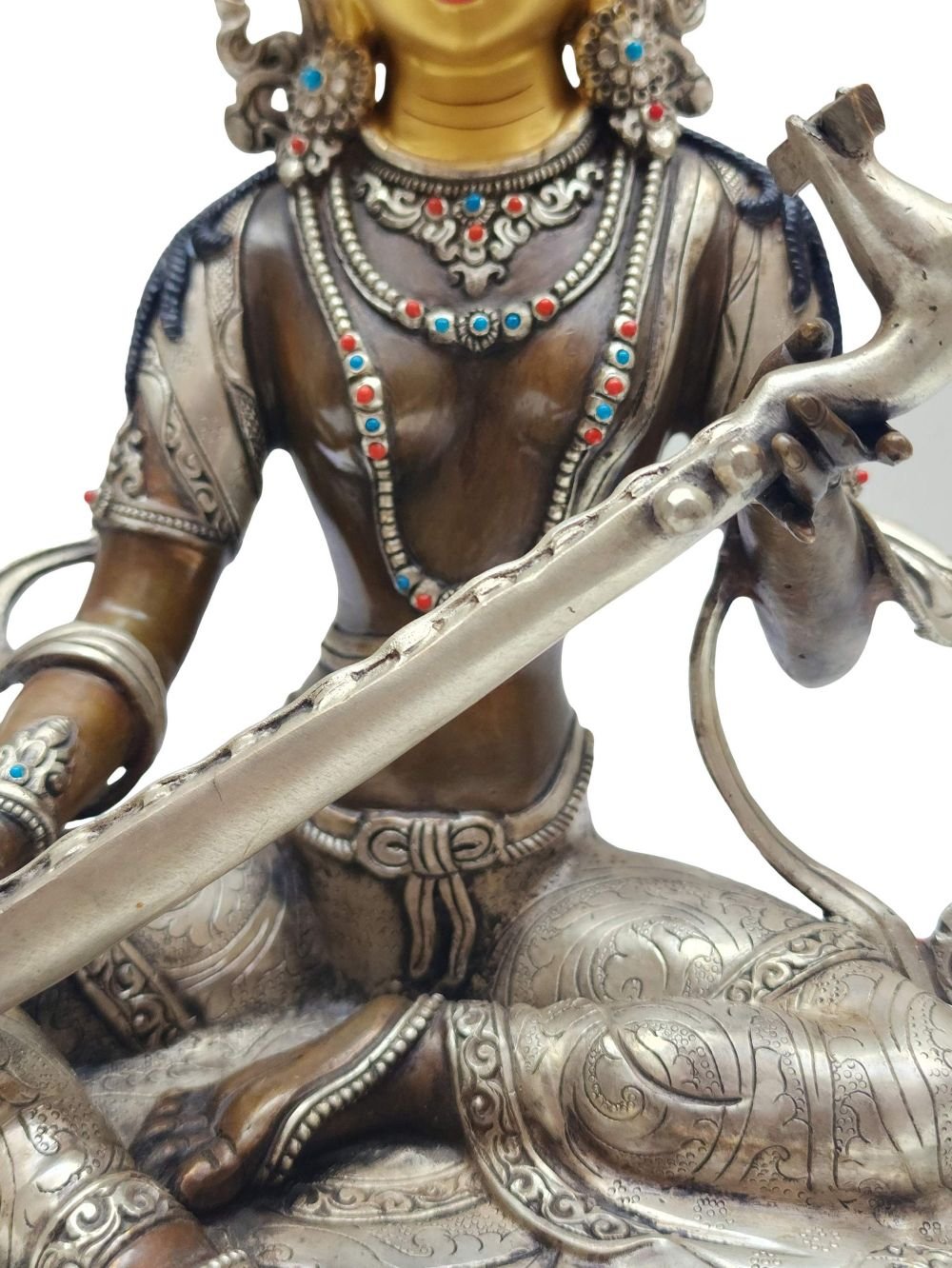 The face of Saraswati is painted with gold to enhance its significant features, particularly the eyes, and lips. This detailed painting is essential as it brings forth the crucial attributes of the expression of eyes and lips that metal carving alone cannot capture.