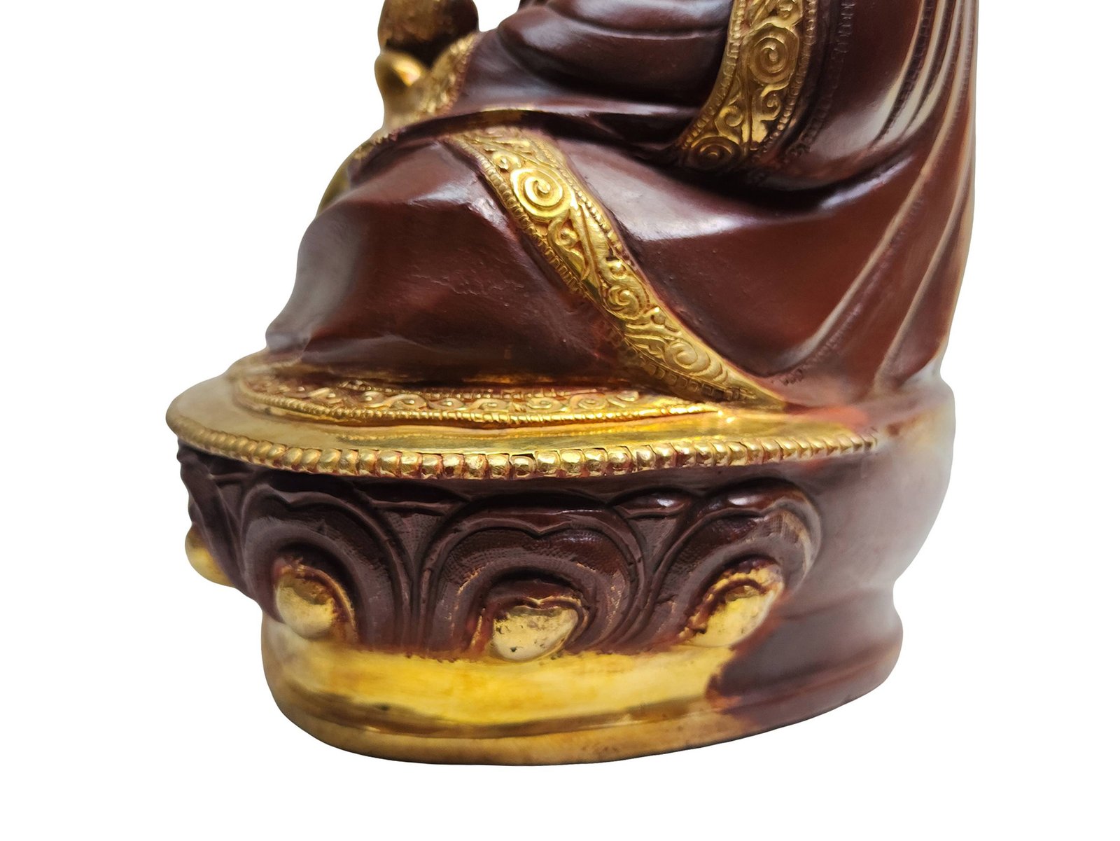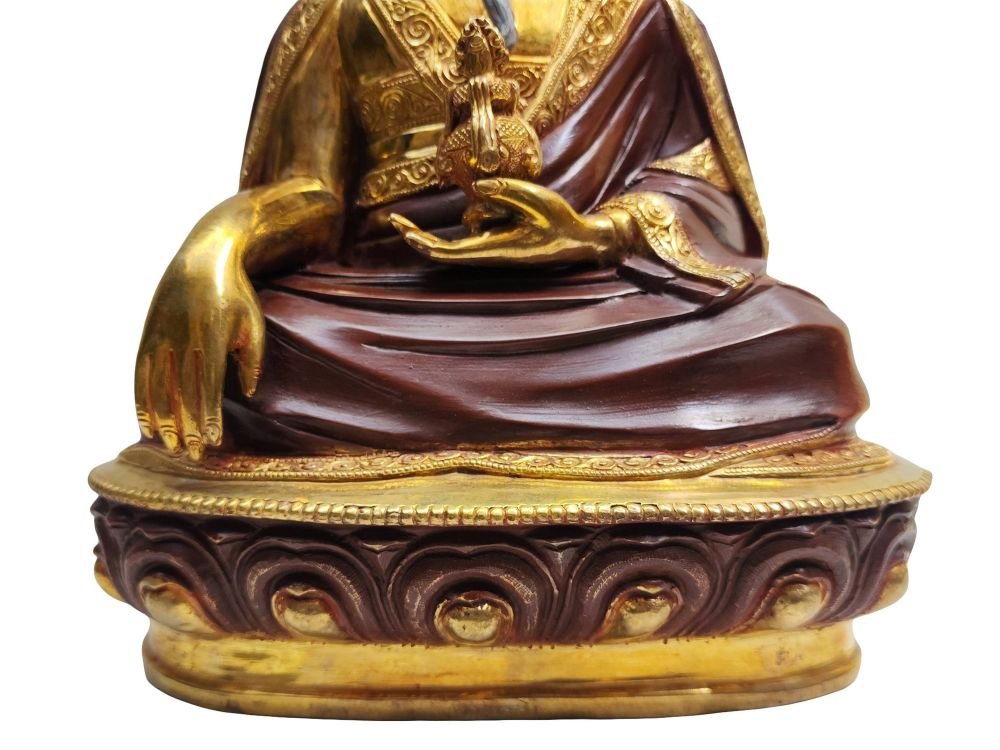 This 4th Zhabdrung Rinpoche has a Partly gold-plated finish. Partly fire gold gilding, a common practice in Nepali handicrafts. This technique is skillfully employed by artisans to create intricate designs on various metal objects, including statues, jewelry, and decorative items. Through a process, a mask or resist is applied to safeguard specific areas from the gold plating. The object is then subjected to high temperatures, allowing the gold to beautifully adhere to exposed surfaces using a combination of heat and pressure.