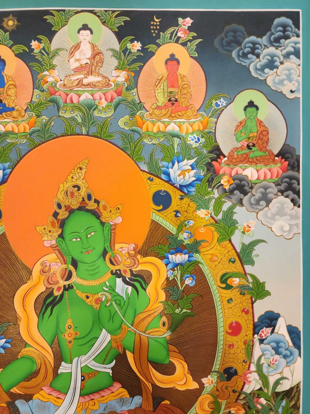 Green Tara Thangka Painting with Pancha Buddha, Buddhist Traditional Painting, Real Gold, Tibetan Style, Three Goddess of Divine Grace , Goddess of Compassion, Protection, and Swift Action