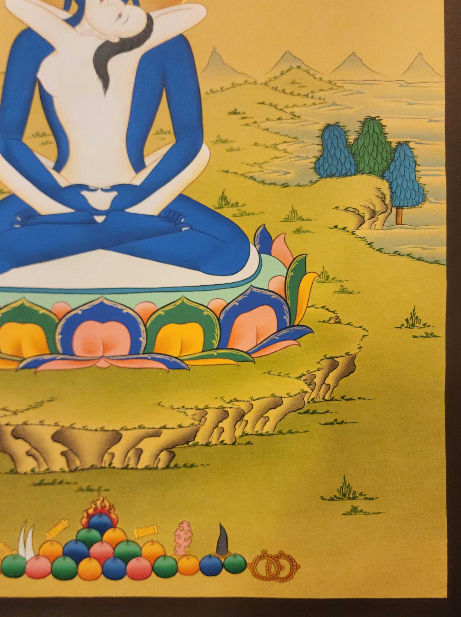 Samantabhadra also known as Visvabhadra, is naked called 'sky clad' , presented embracing figures the white female figure is called Samantabhadri in an body position [Skt. Asana] called Yib-Yum togetherness known as the body of blissful union called Sambhogakaya. The word Samantabhadra means Universal loving Virtue. A union of the inner and outer world. The principle of duality is visualized in male & female, dark-light, love-hate, day & night. The co-emergence [Skt. Sahaja] of wisdom [Skt. Prajna] with fitness of action [Skt. Upaya] which is similar to compassion leads one to a state of Great Bliss [Skt. Mahasukha]. The state of Great Bliss is akin to individual Nirvana.The eight embedded jewels represent the Eightfold Path realised by Sakyamuni. There is a small mirror [Skt. Aina or Darpana] representing introspection, sight or form together with a jewel offering in the foreground. The two hand symbols [Tib. Ting Sha] represent the sense offering of sound. The rainbow beams arising from the crimson nimbus around the head of Samanta Bhadra represent a mastery of Boddhi Nature & one manifestation of the Sambhogakaya is the Rainbow Body. There is a small mirror [Skt. Aina or Darpana] representing introspection, sight or form together with a jewel offering in the foreground. The two hand symbols [Tib. Ting-Sha] represent the sense offering of sound. The rainbow beams arising from the crimson nimbus around the head of Samanta Bhadra represent a mastery of Boddhi Nature & one manifestation of the Sambhogakaya is the Rainbow Body. The co-emergence [Skt. Sahaja] of wisdom [Skt. Prajna] withfitness of action [Skt. Upaya] which is similar to compassion leads one to a state of Great Bliss [Skt. Mahasukha].