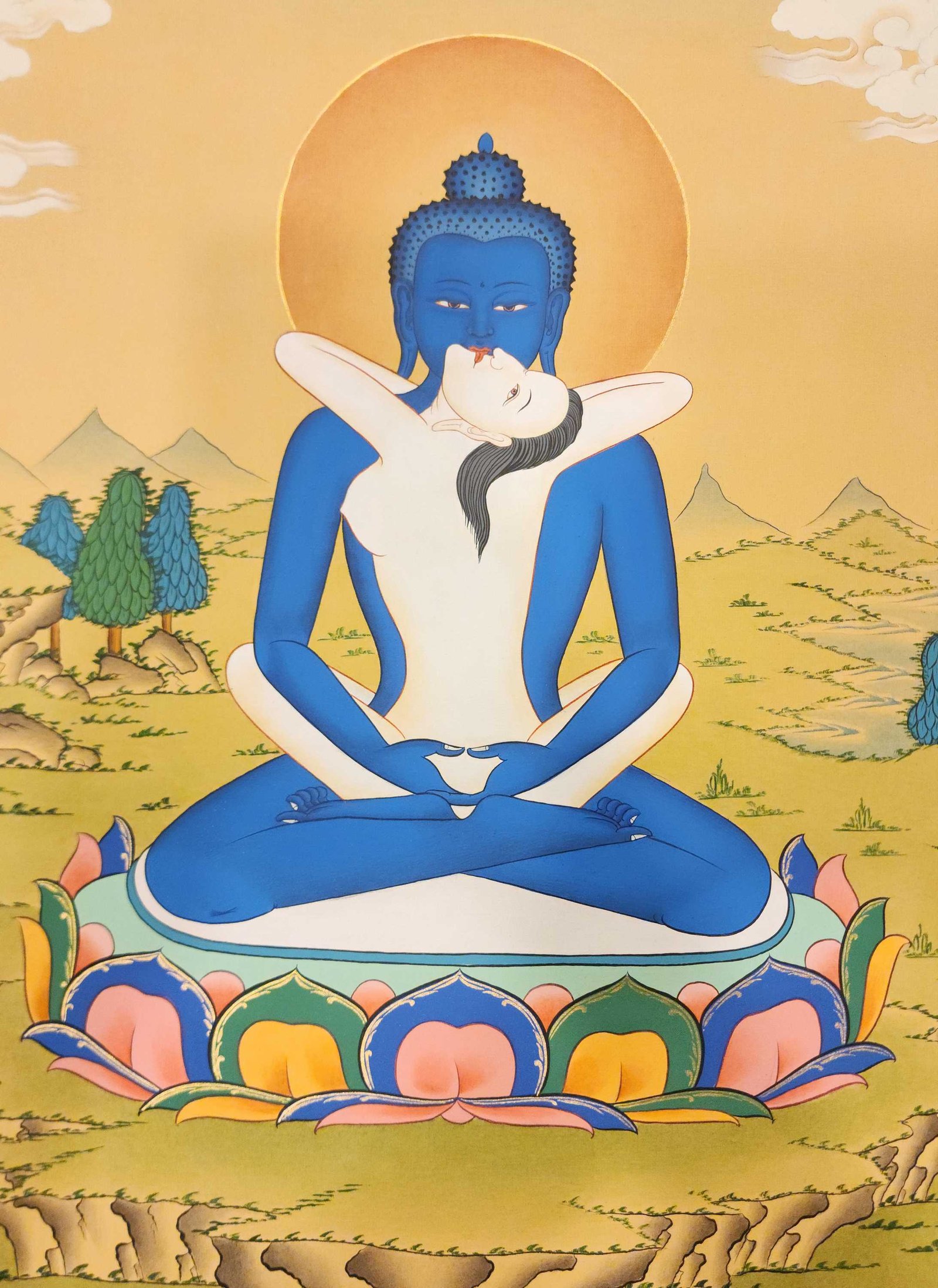 2. Samantabhadra symbolises the union of two. In Hinduism this union is perceived as a union of the atman [the self] with the Brahman [infinite universe]. But in Buddhism the Brahman is perceived as merely another aspect of form, & so in being a described form a veil hindering the realisation of pure consciousness. In Buddhism this union usually refers to two leading ideas which are A. The eternal Present Moment which from the origin, the Awoken Mind of bodhi realises the union of the past, present & future within the ever flowering moment of conscious reality. The blue figure of the past embraces the white figure representing the future within the eternal present. In this way Samantabhadra presents timeless awareness who was existing befoe the very notion of time itself.