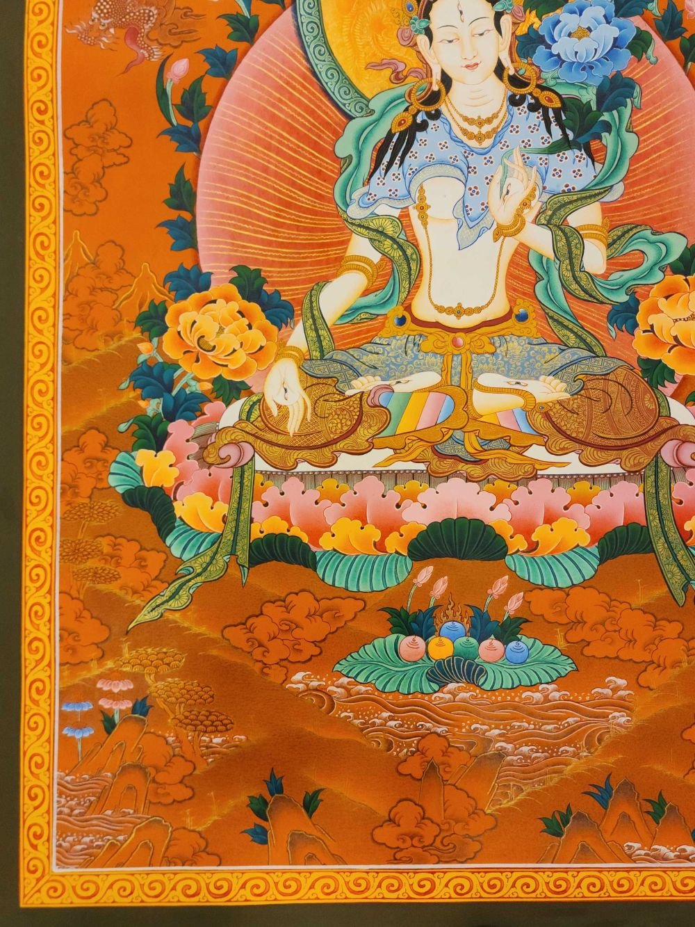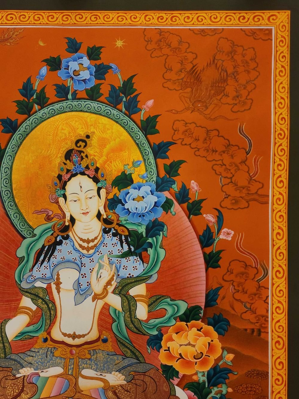 White Tara Thangka, Buddhist Traditional Painting, Tibetan Style, Real Gold, Hand Painted , Goddess of longevity, healing, and serene compassion
