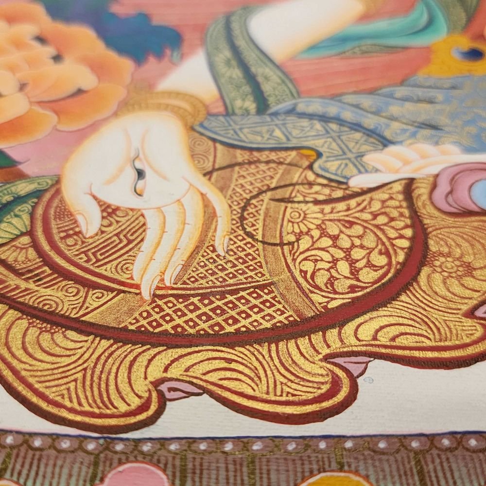 This thangka of White Tara has real gold painted on its surface along with other paints. This is an ancient process of decorating the thangka in Tibetan Buddhism, Here gold is ground into gold dust, which is then mixed with other undisclosed material to make it paintable on the canvas. this mixture is then mixed with transparent glue and painted on the thangka. Read More