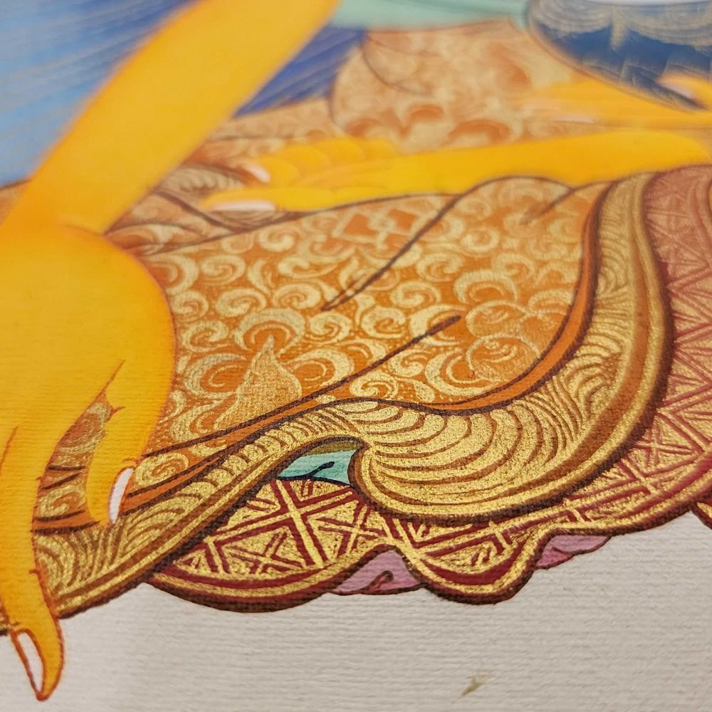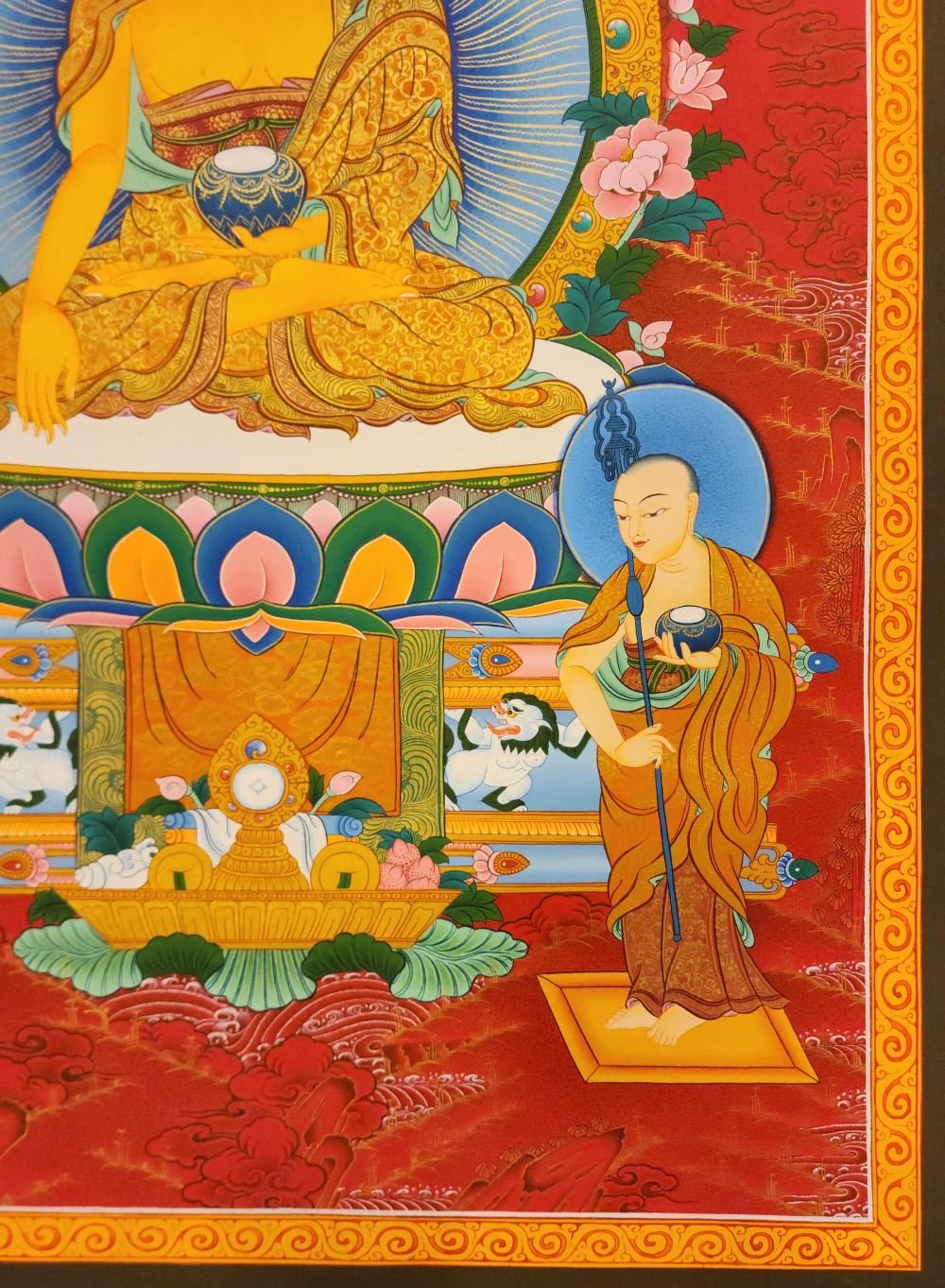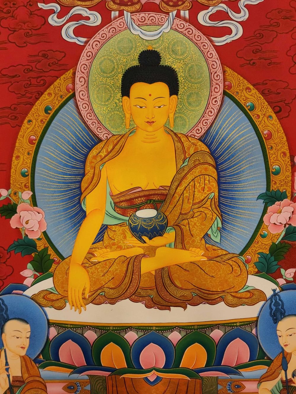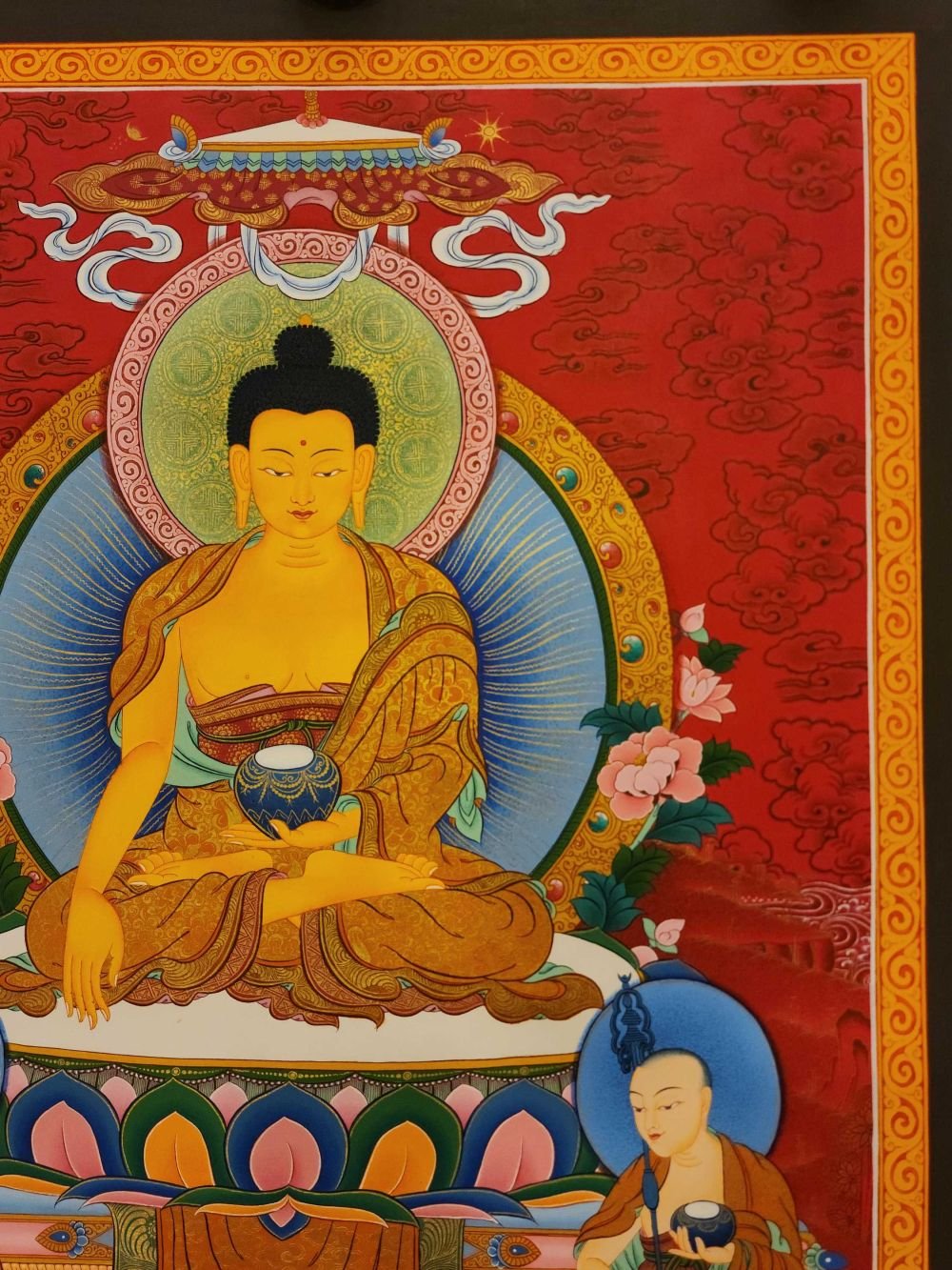 This thangka of Shakyamuni Buddha has real gold painted on its surface along with other paints. This is an ancient process of decorating the thangka in Tibetan Buddhism, Here gold is ground into gold dust, which is then mixed with other undisclosed material to make it paintable on the canvas. this mixture is then mixed with transparent glue and painted on the thangka. Read More