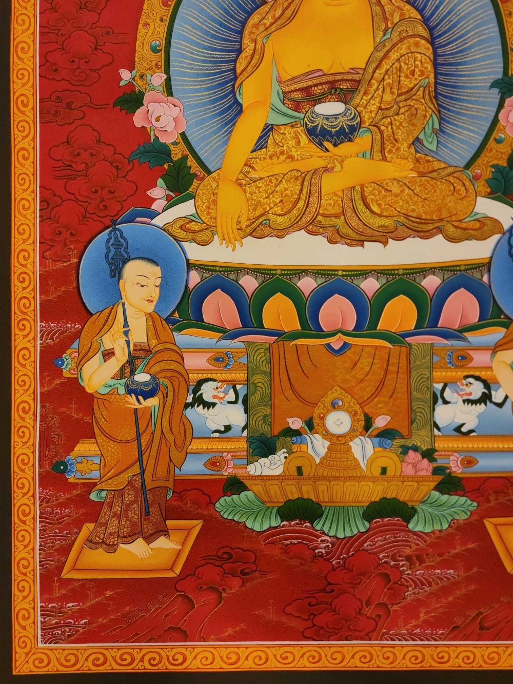 Shakyamuni Buddha Thangka, Buddhist Traditional Painting, Tibetan Style, Real Gold, Hand Painted with Sariputra and Maudgalyayana , The Enlightened One and Teacher of Humanity