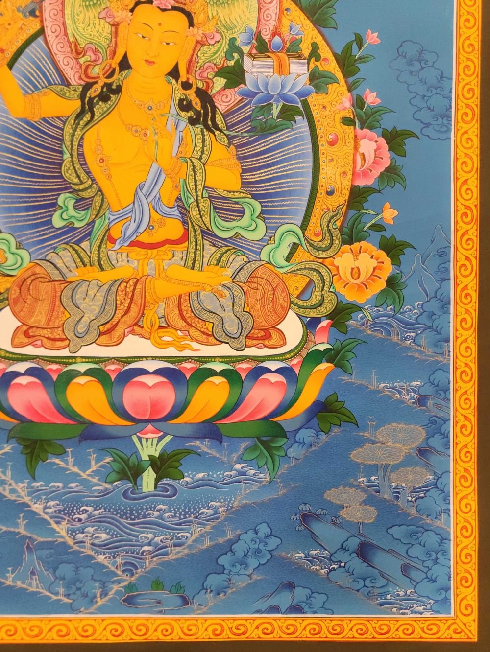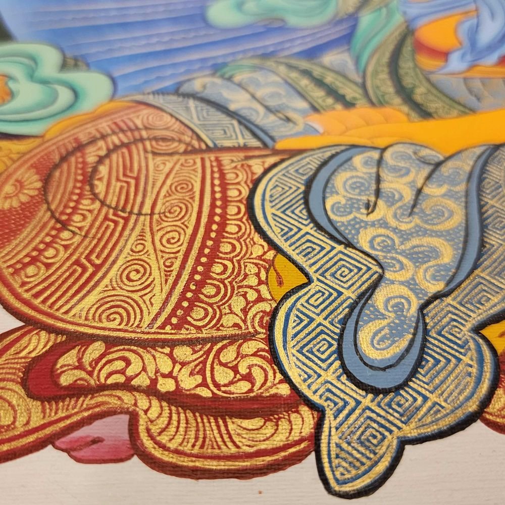 This thangka of Manjushri has real gold painted on its surface along with other paints. This is an ancient process of decorating the thangka in Tibetan Buddhism, Here gold is ground into gold dust, which is then mixed with other undisclosed material to make it paintable on the canvas. this mixture is then mixed with transparent glue and painted on the thangka. Read More