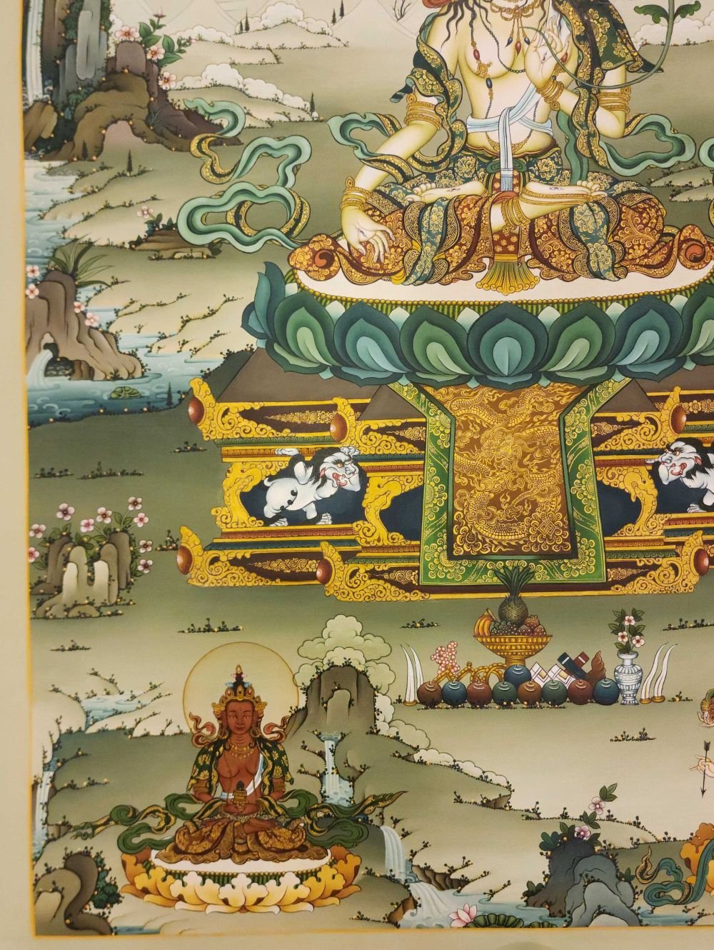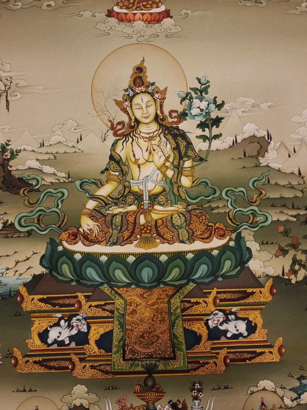 This thangka of White Tara has real gold painted on its surface along with other paints. This is an ancient process of decorating the thangka in Tibetan Buddhism, Here gold is ground into gold dust, which is then mixed with other undisclosed material to make it paintable on the canvas. this mixture is then mixed with transparent glue and painted on the thangka. Read More