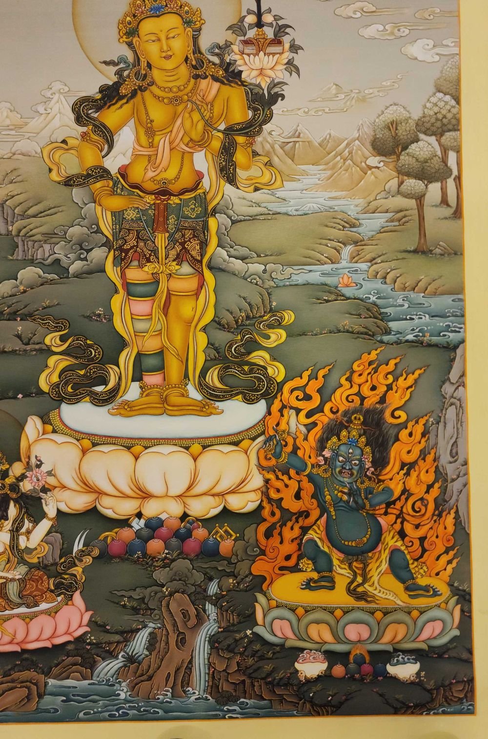This thangka of Manjushri has real gold painted on its surface along with other paints. This is an ancient process of decorating the thangka in Tibetan Buddhism, Here gold is ground into gold dust, which is then mixed with other undisclosed material to make it paintable on the canvas. this mixture is then mixed with transparent glue and painted on the thangka. Read More