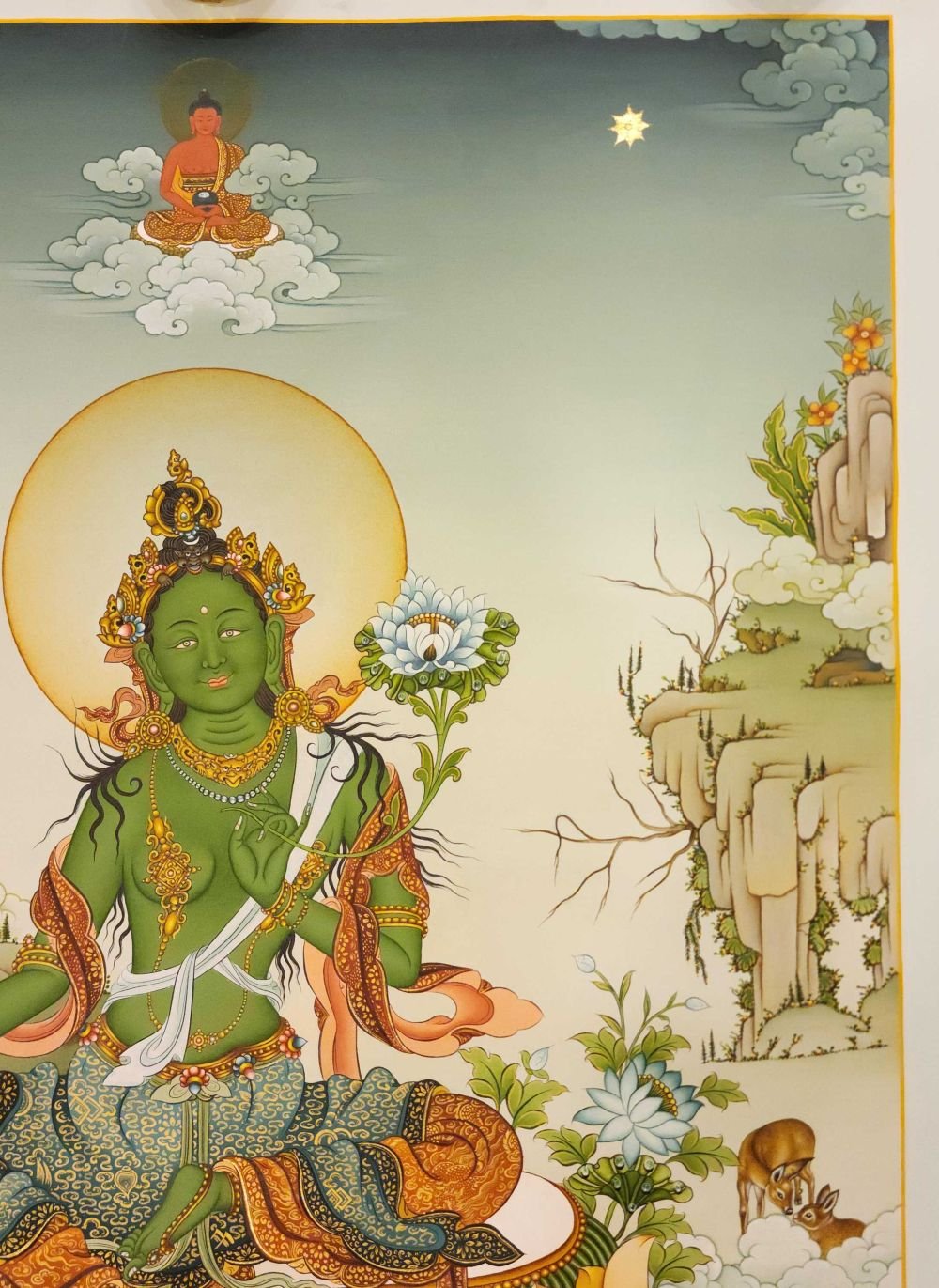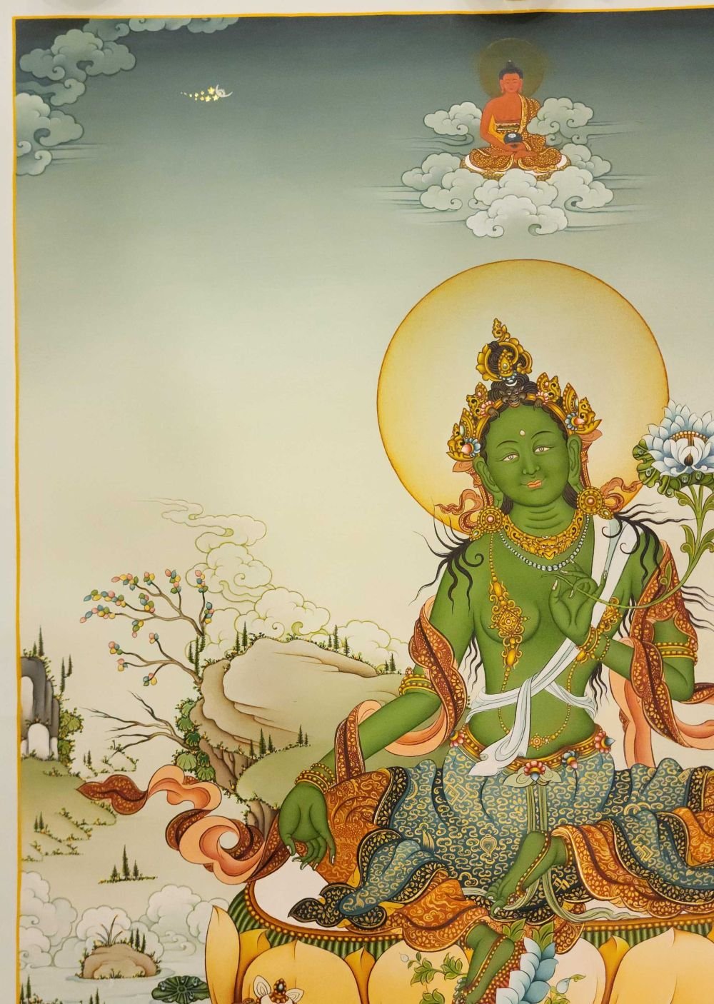 Green Tara's special lotus is the blue lotus or 'night lotus' which she bears in both hands. The word utpala means to 'burst open'. Her left-hand holds a stem with an open blooming flower and an unopened bud. The bent lower part of the stem represents the root. The open blossom represents the present and also the present Buddha; the bud represents the future and also Buddhas yet to be born. The future here also refers to a safe journey's end and future well-being. Her right-hand wisdom hand is in the gesture of giving refuge. The third finger touches the thumb to create a circle representing the union of wisdom and compassion, and the three extended fingers symbolize the Three Jewels of Buddhism a. The Buddha State b. The Body of Teachings. The Principles of the Universe The same hand holds the stem of a blue lotus representing her willingness to assist. The closed blossom in her right hand represents the past and also the Buddhas of the past. Green Tara is shown in a place of paradise called Khadiravani where she Tara dwells. Khadiravani is described as a great mountain kingdom with many trees, flowers, and animals (not shown). 3 rainbow tails emanate from her outer aureole. The crescent moon and sun symbolize the union of male and female ubiquitous in Tantric art.