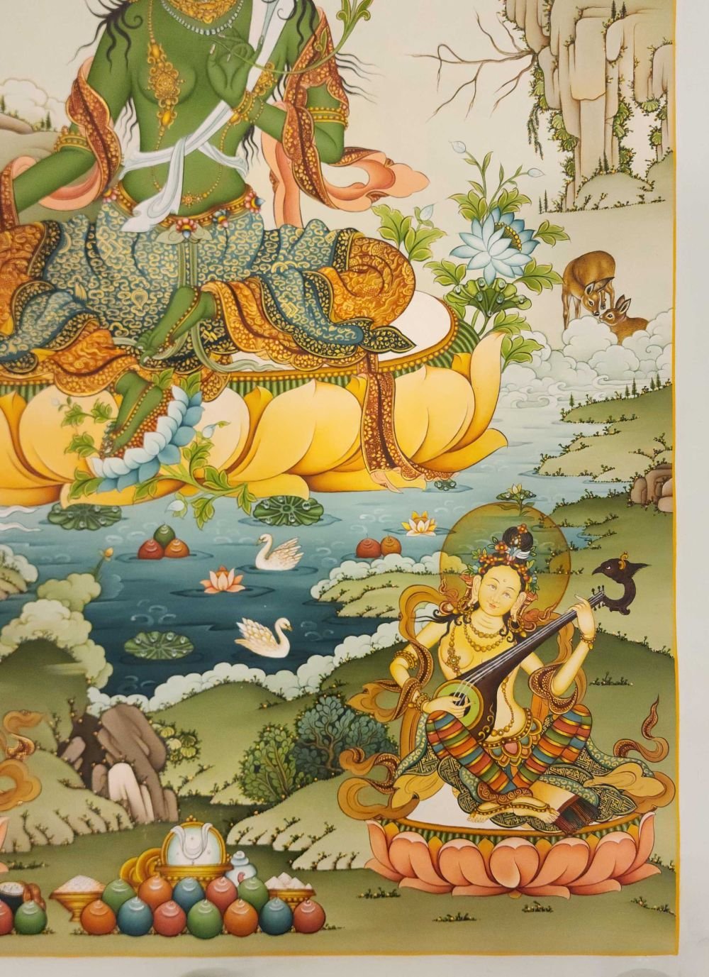 Green Tara Thangka, Master Quality Buddhist Traditional Painting, Karma Gadri Art, Real Gold, with Three Goddess of Divine Grace , Goddess of Compassion, Protection, and Swift Action