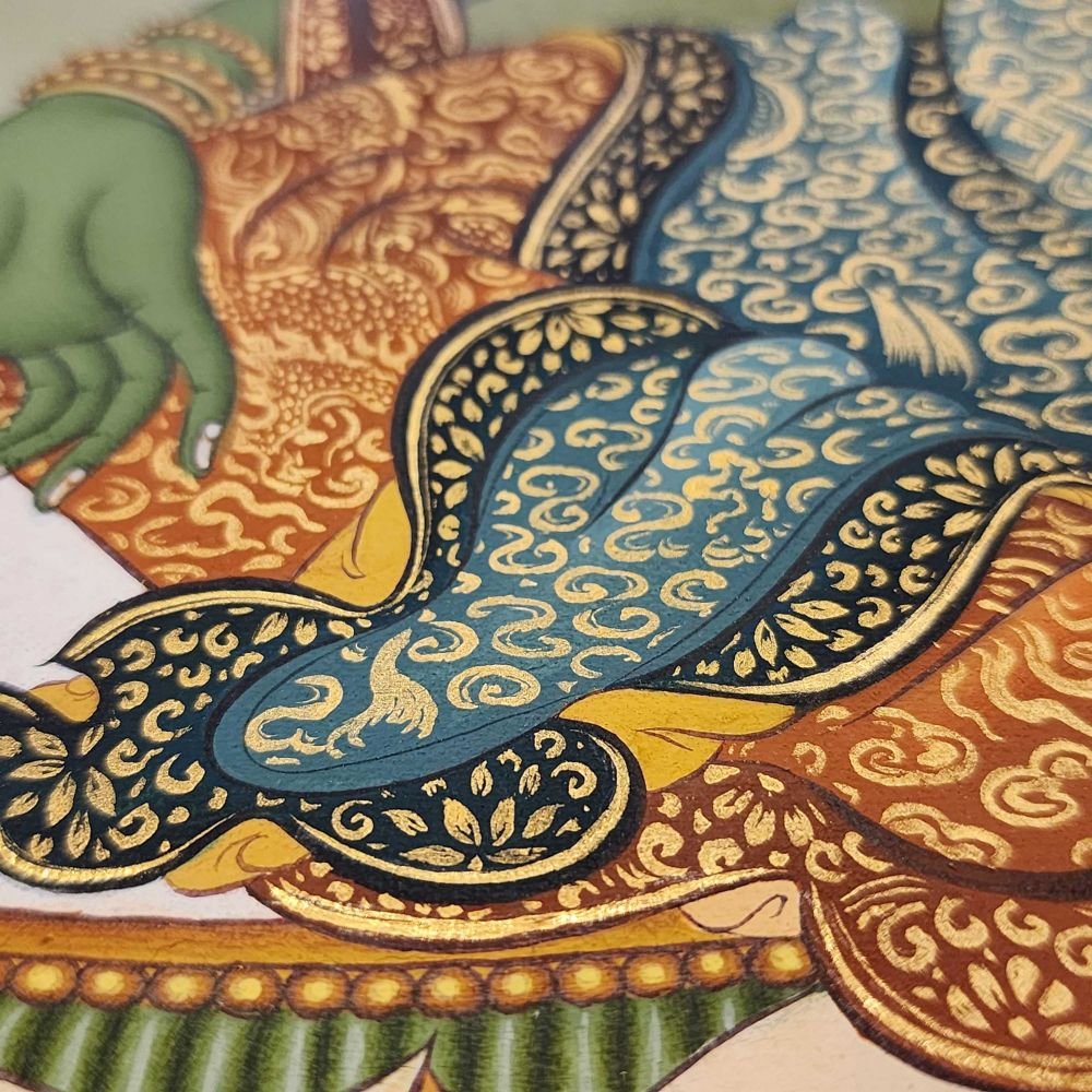 This thangka of Green Tara has real gold painted on its surface along with other paints. This is an ancient process of decorating the thangka in Tibetan Buddhism, Here gold is ground into gold dust, which is then mixed with other undisclosed material to make it paintable on the canvas. this mixture is then mixed with transparent glue and painted on the thangka. Read More