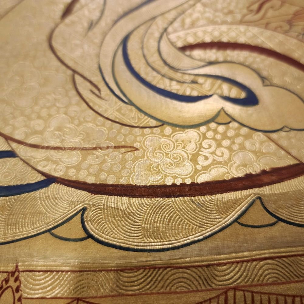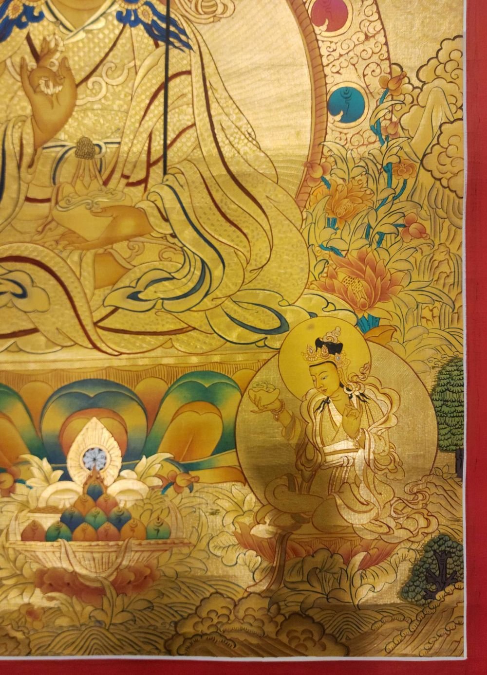 This thangka of Padmasambhava has real gold painted on its surface along with other paints. This is an ancient process of decorating the thangka in Tibetan Buddhism, Here gold is ground into gold dust, which is then mixed with other undisclosed material to make it paintable on the canvas. this mixture is then mixed with transparent glue and painted on the thangka. Read More