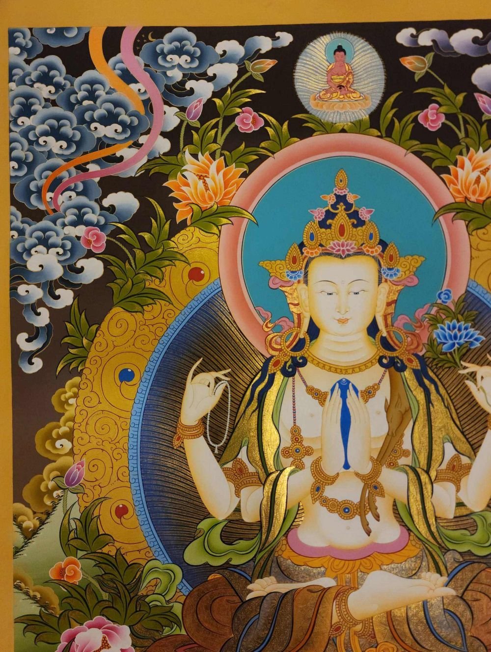 Chenrezig Thangka, Master Quality Buddhist Traditional Painting, Tibetan Style, Real Gold, Three Great Bodhisattvas , Bodhisattva of Compassion, Protector of All Beings