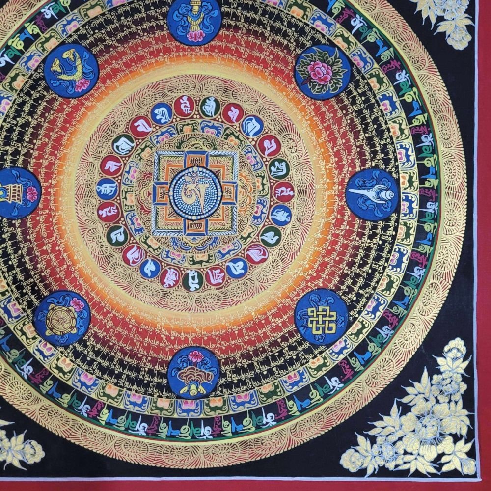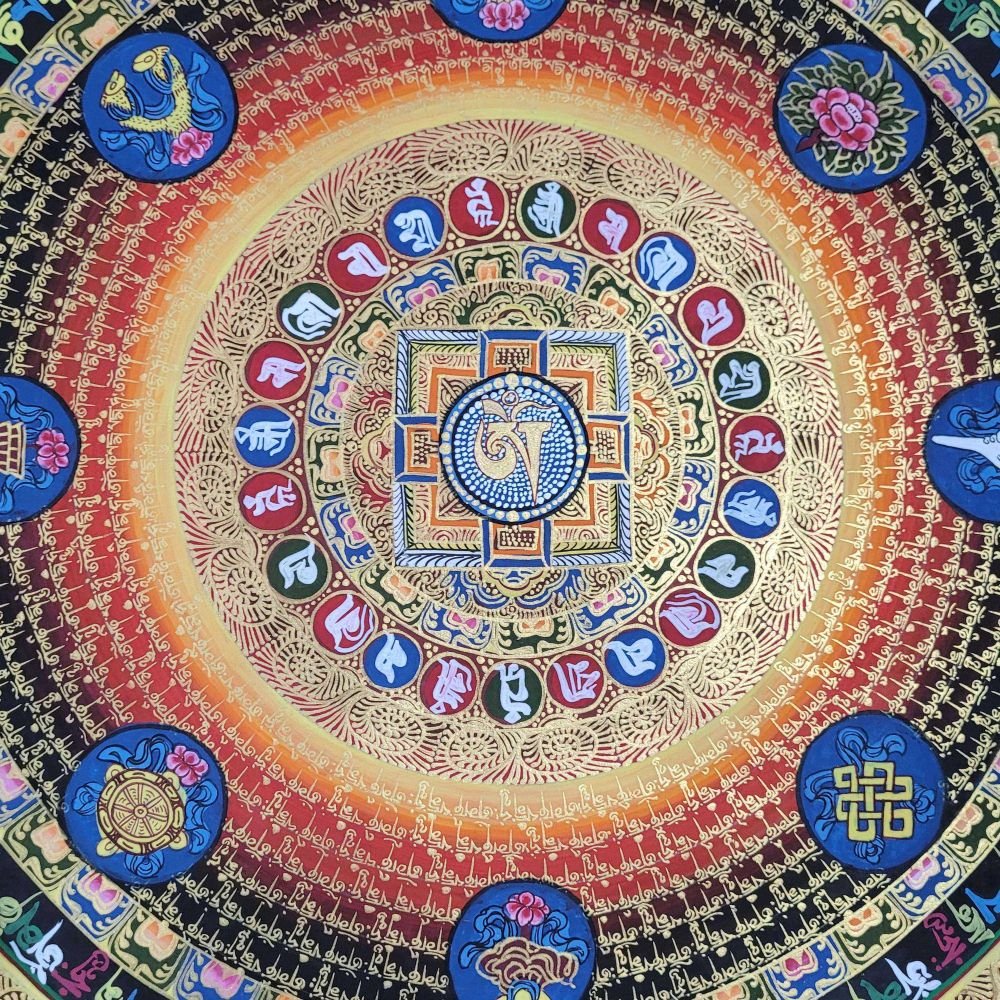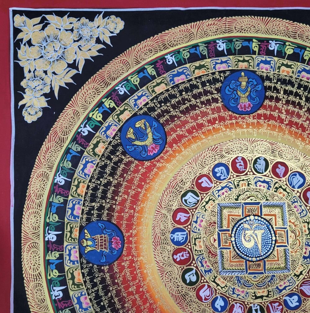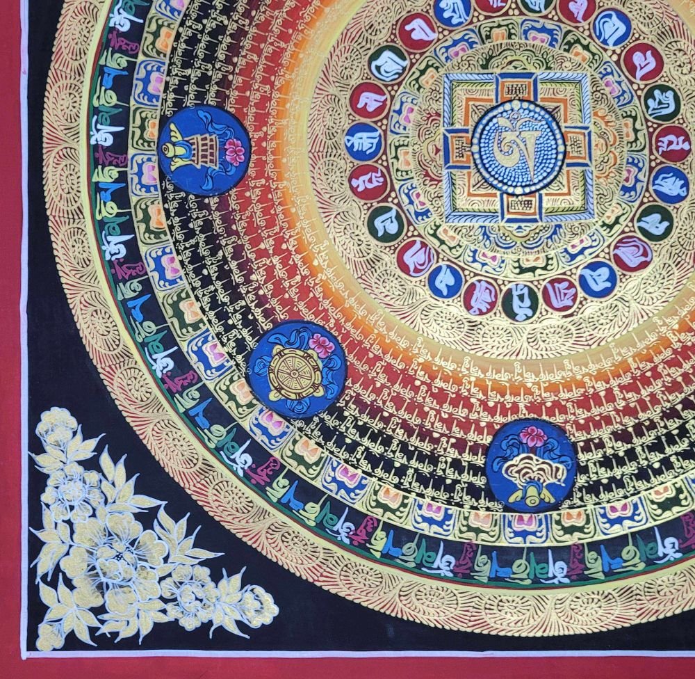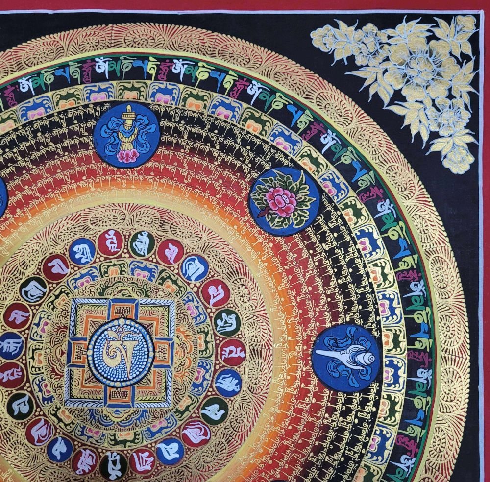 OM MANI PADME HUM is also inscribed in Mandala paintings. Those kinds of mandala have OM MANI PADME HUM in a circular fashion, and mantras are painted in concentric circles from the surface to the center of the circle. They come under the categories of the Mantra Mandala. These mandalas are usually found hanging on the walls of Buddhist monasteries and are often used in meditation halls for focus and concentration purposes.