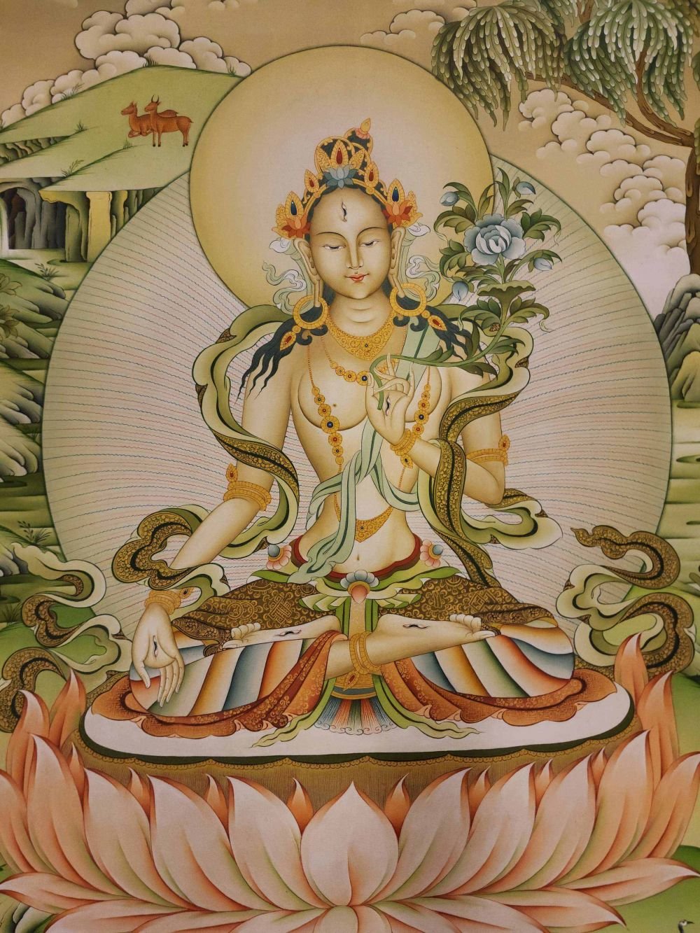 White Tara Thangka, Master Quality, Buddhist Traditional Painting, Karma Gadri Art Style, Rare Find , Goddess of longevity, healing, and serene compassion