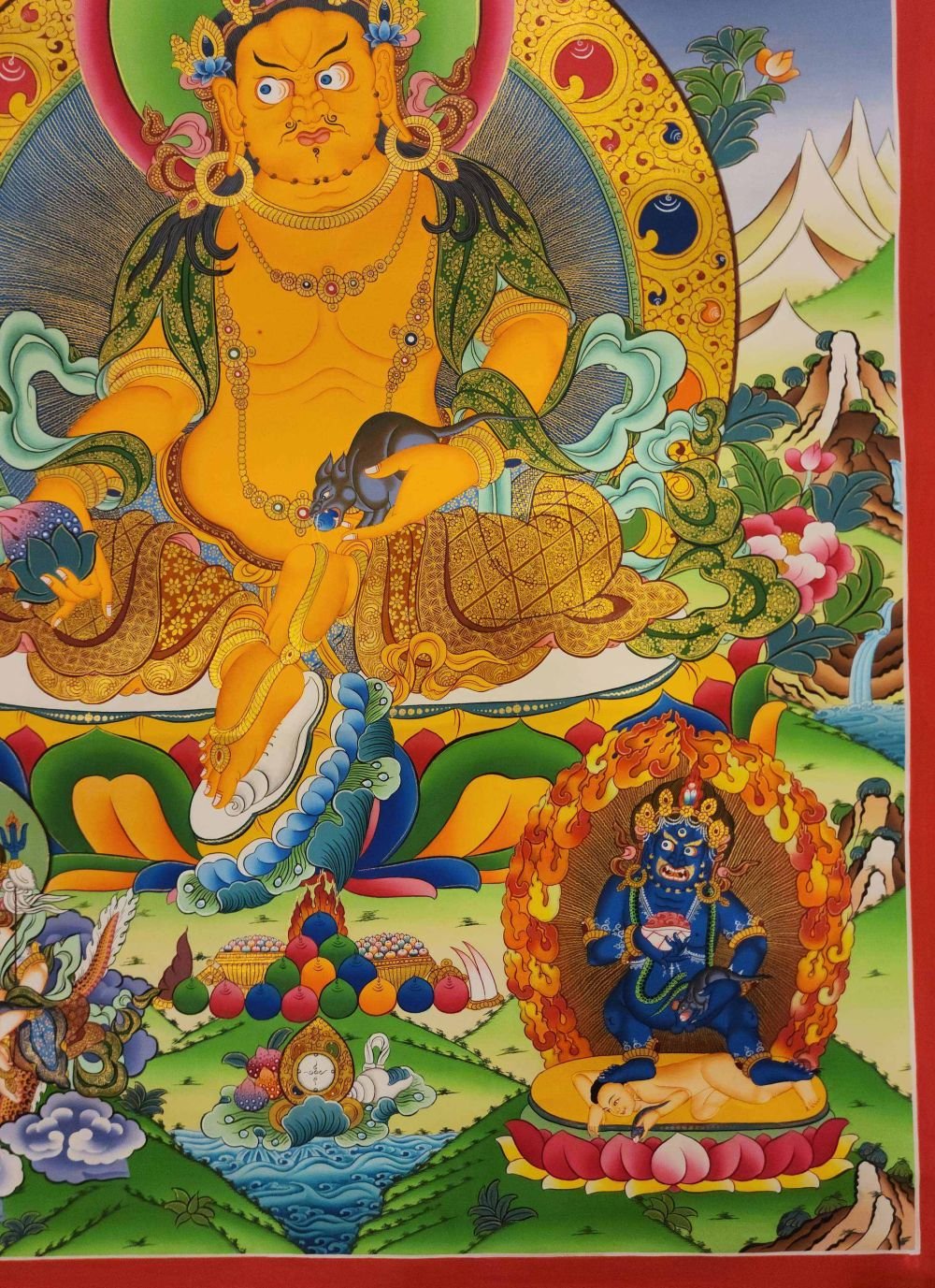 Yellow Jambala is the manifestation of Buddha Ratnasambhava. He protected the dharma and if anyone calls his name, he will come and help the person. If one has trouble with finance or anything, one can chant his mantra and he will come and help. But one must have a bodhi mind and practice Buddhism properly to attain his blessings. One can also gain wealth, wisdom, intelligence, and at last! Attain Buddha hood!. Yellow Jambala sits on a lotus, sun, and moon disk. He holds a mongoose in his left hand and from its mouth spews forth precious jewels.