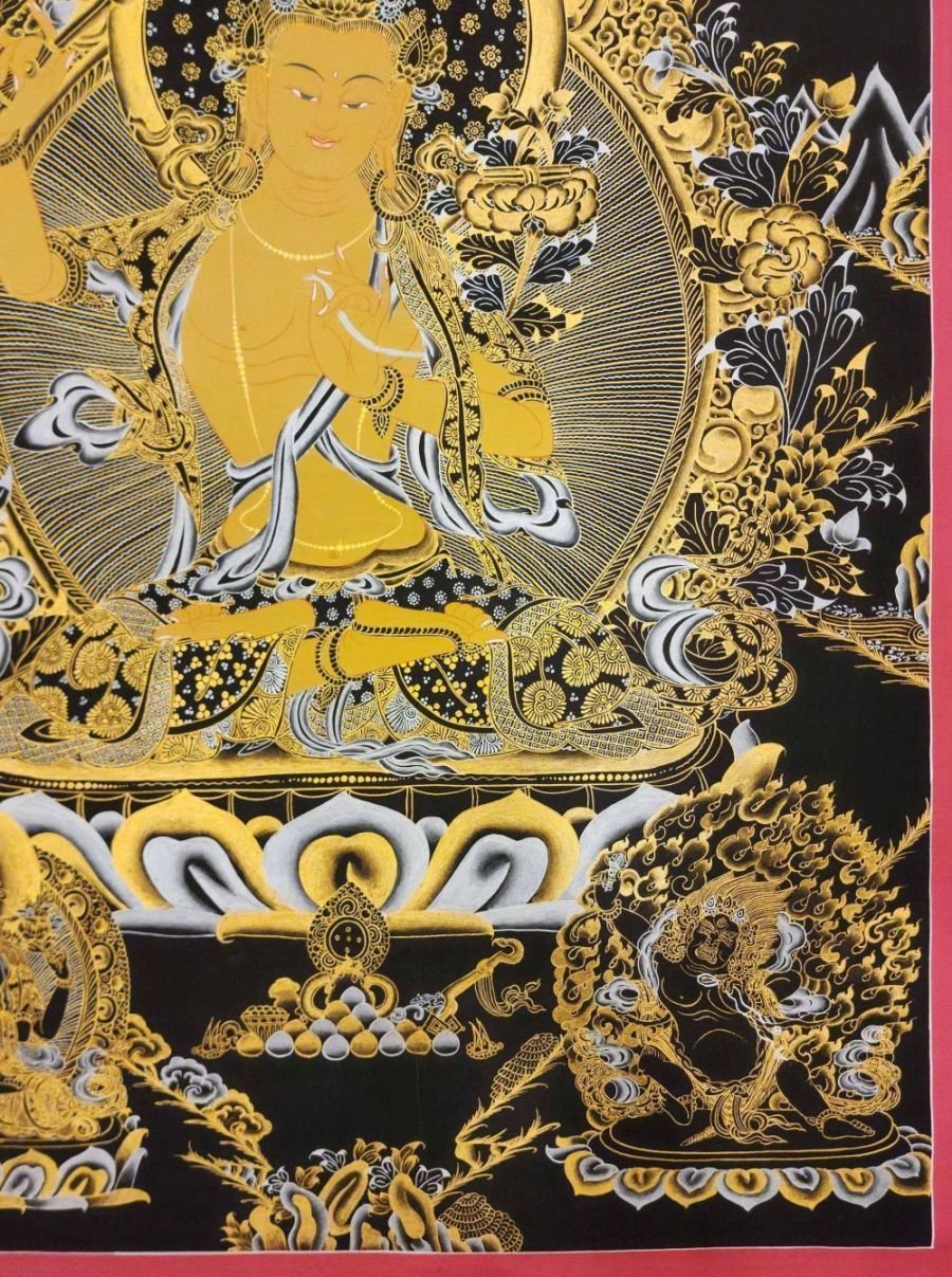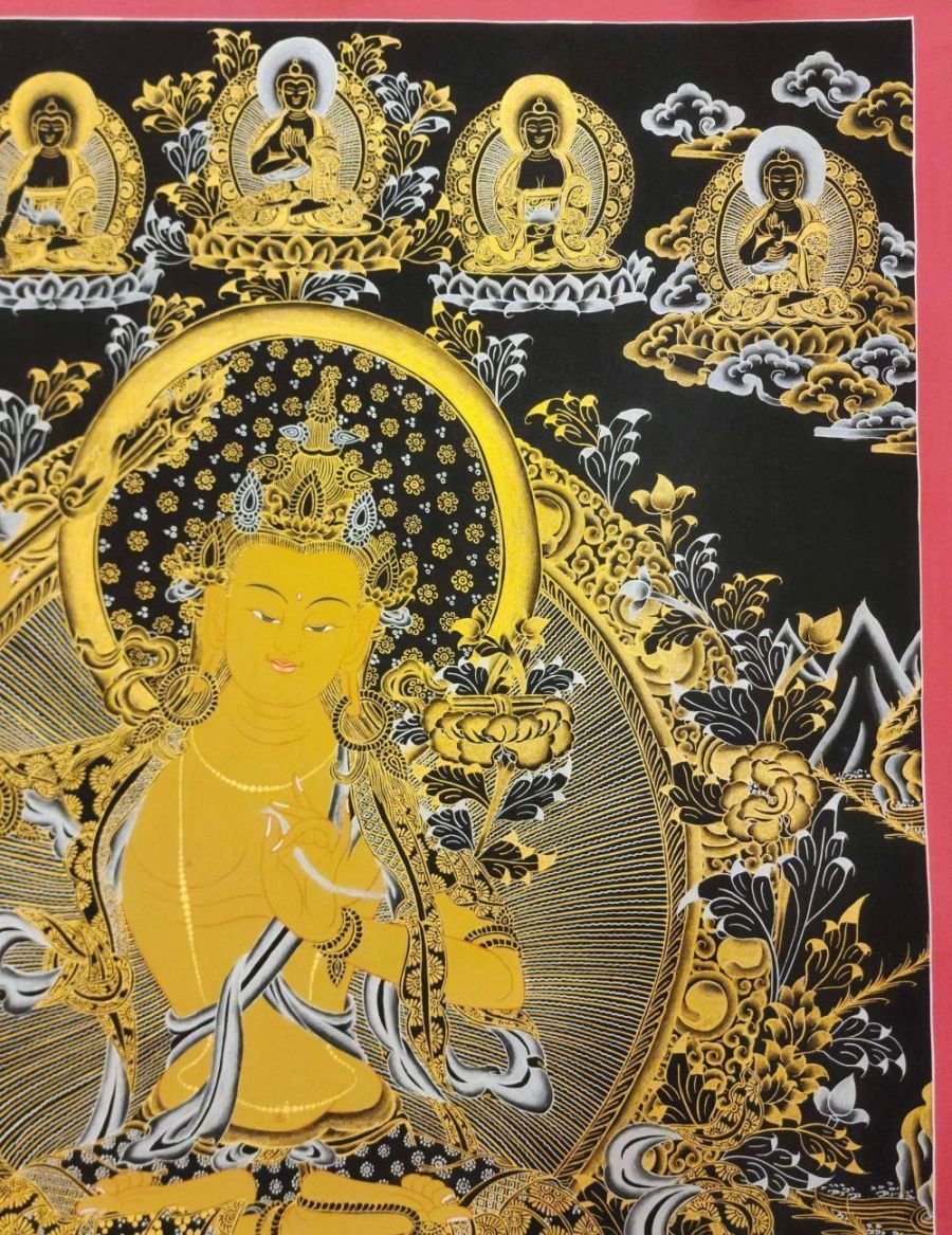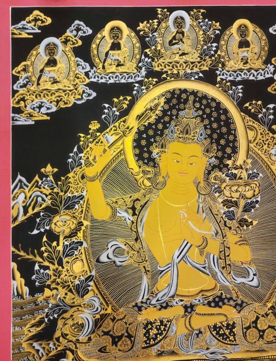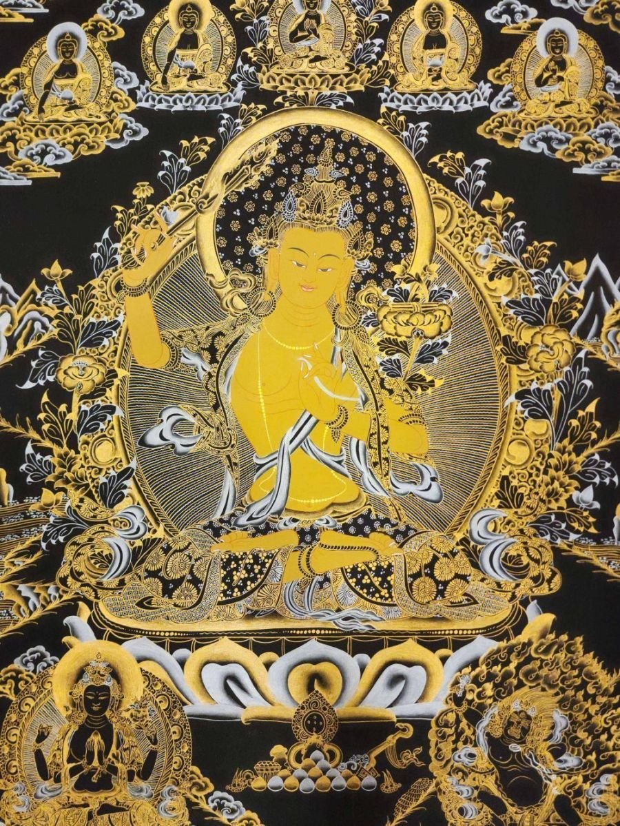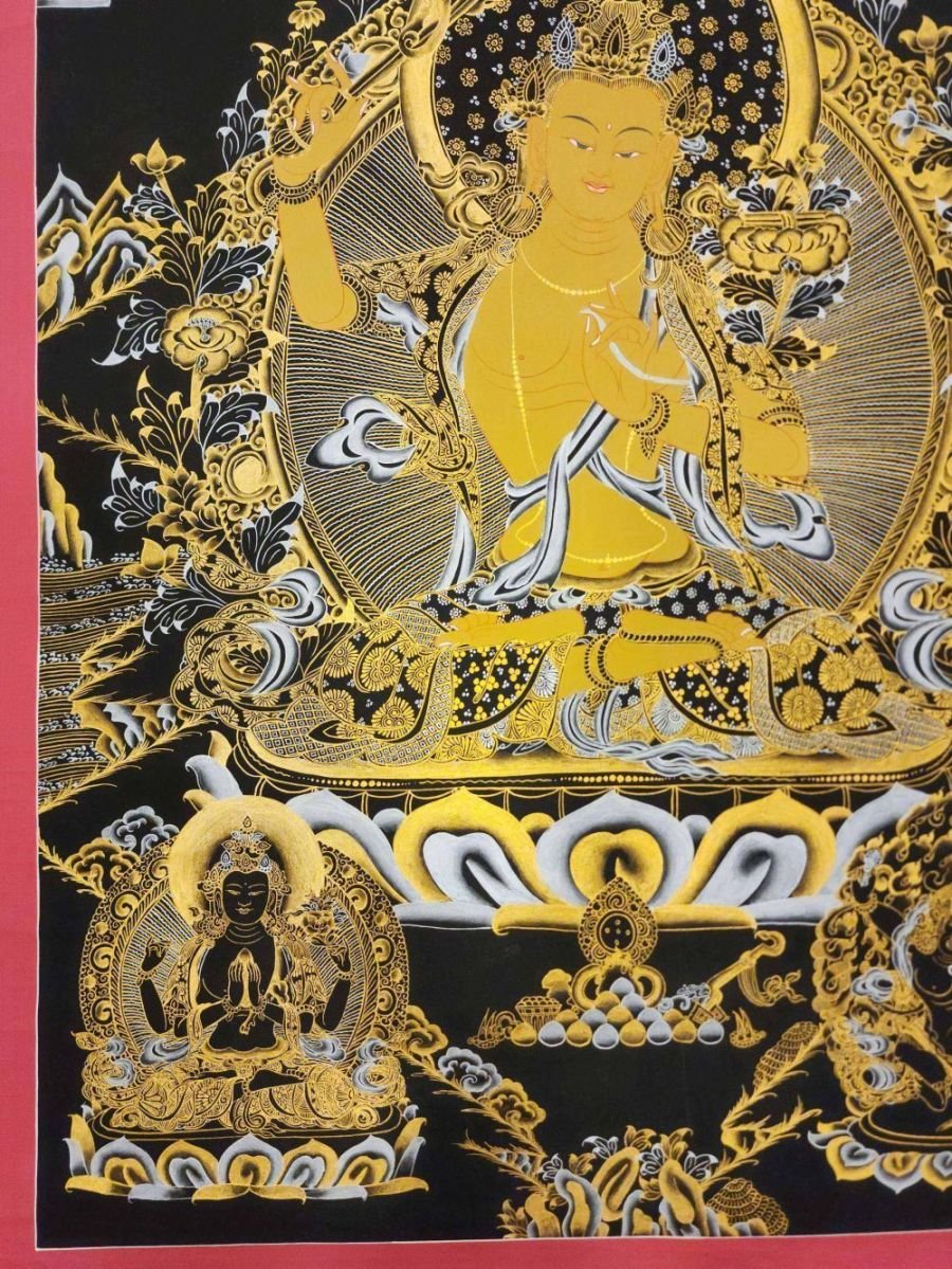 Manjushri Thangka with Pancha Buddha, Buddhist Traditional Painting, Tibetan Style, Three Great Bodhisattvas , Wisdom Buddha, cutting through ignorance with the sword of insight