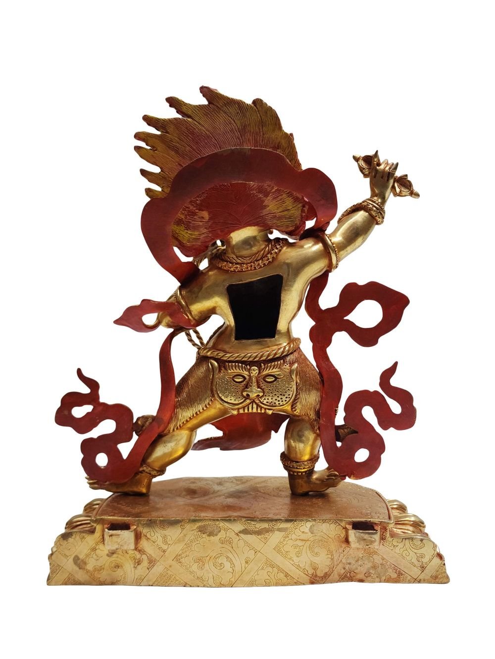 Vajrapani is pictured dancing wildly within a halo of flames, which represent transformation.