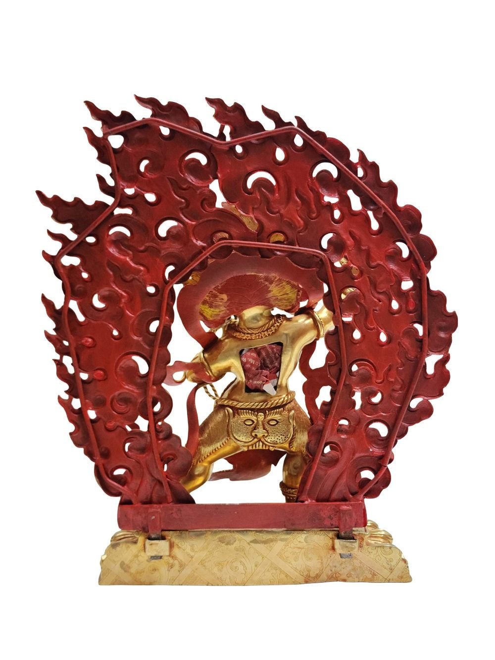 This Vajrapani is finished with full gold plating. also known as mercury gold plating or fire gold plating. This traditional technique involves the application of a genuine layer of gold onto the Vajrapani. Referred to as mercury gold plating, it is considered the correct and authentic form of gold plating in Nepal. Despite being more expensive than electroplating, this traditional mercury gold plating is gaining popularity again in Nepal. People are drawn to its authenticity, longevity, and the unmatched beauty it brings to the Vajrapani. The resurgence of interest in this traditional form of gold plating reflects a growing appreciation for the craftsmanship and cultural heritage of Nepal Read More