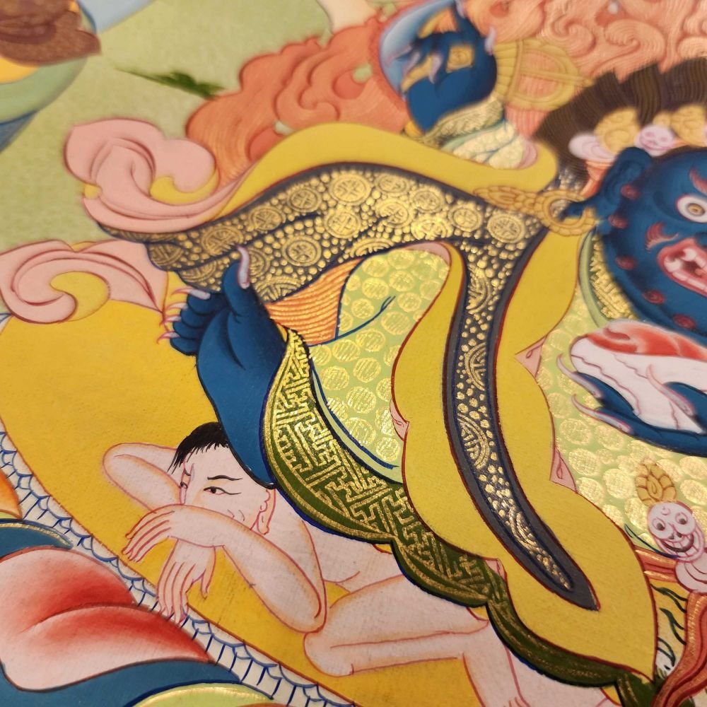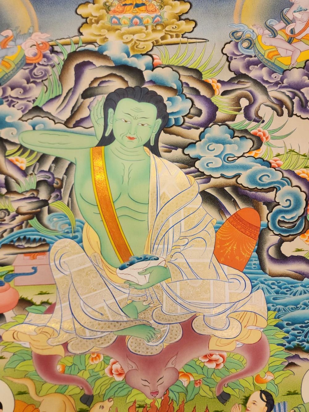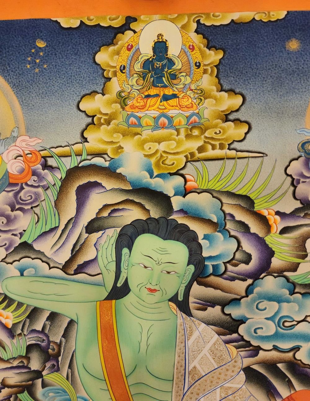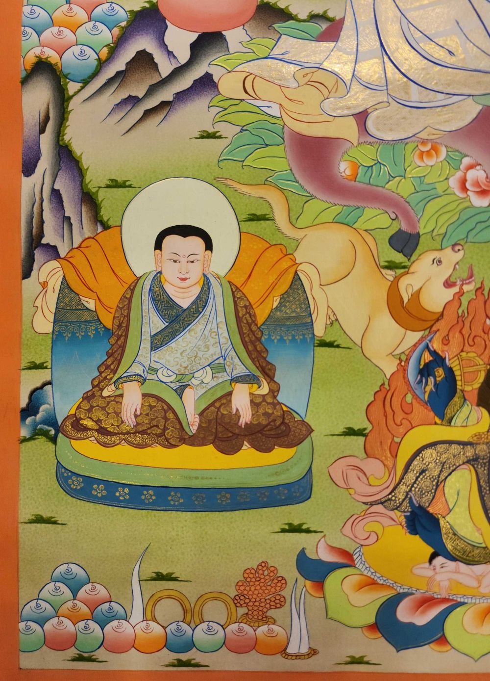 This thangka of Milarepa has real gold painted on its surface along with other paints. This is an ancient process of decorating the thangka in Tibetan Buddhism, Here gold is ground into gold dust, which is then mixed with other undisclosed material to make it paintable on the canvas. this mixture is then mixed with transparent glue and painted on the thangka. Read More