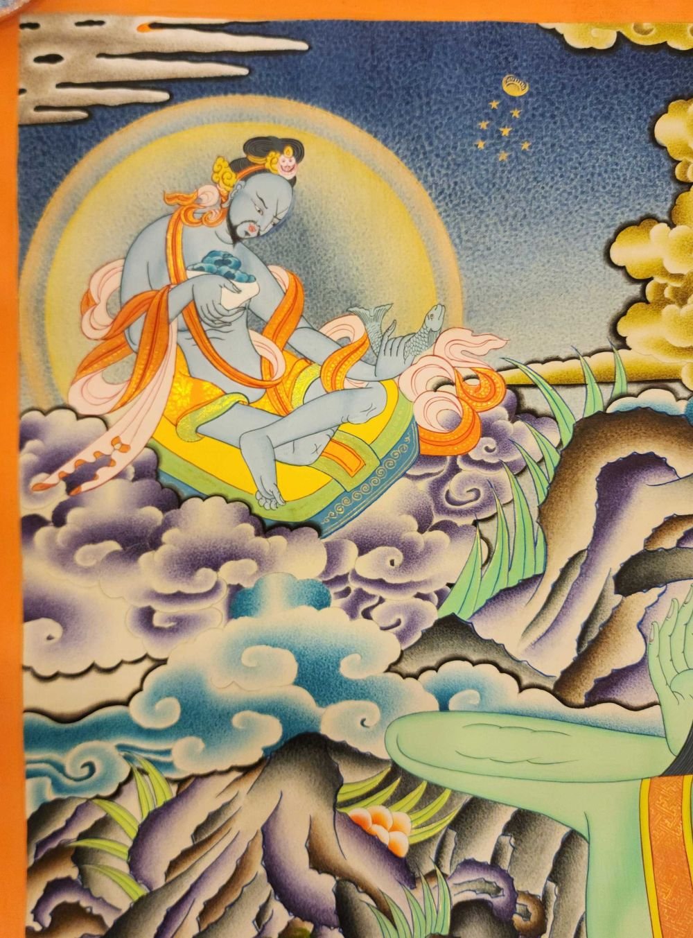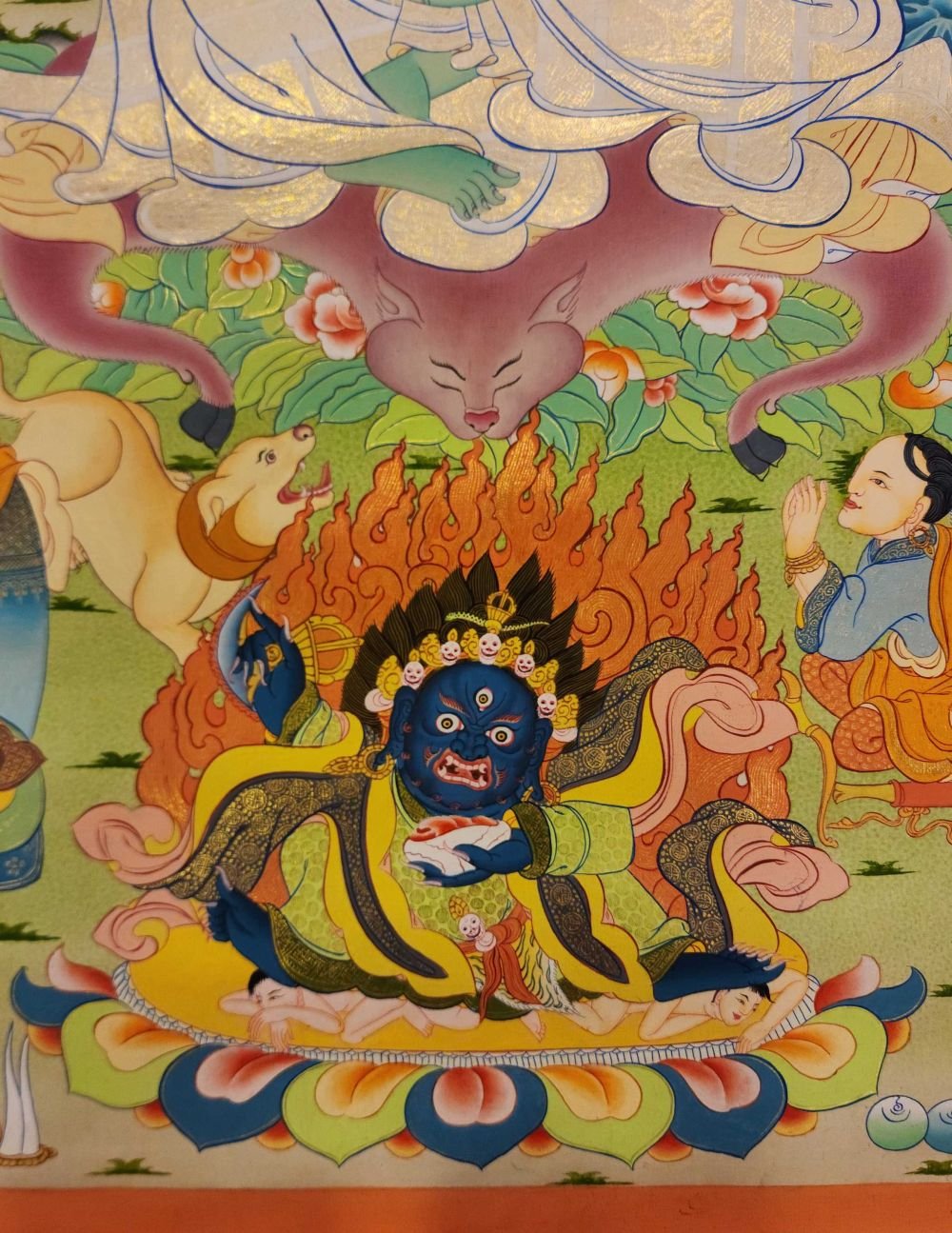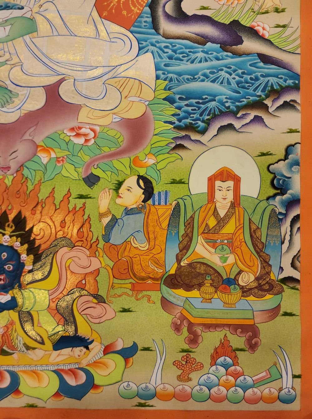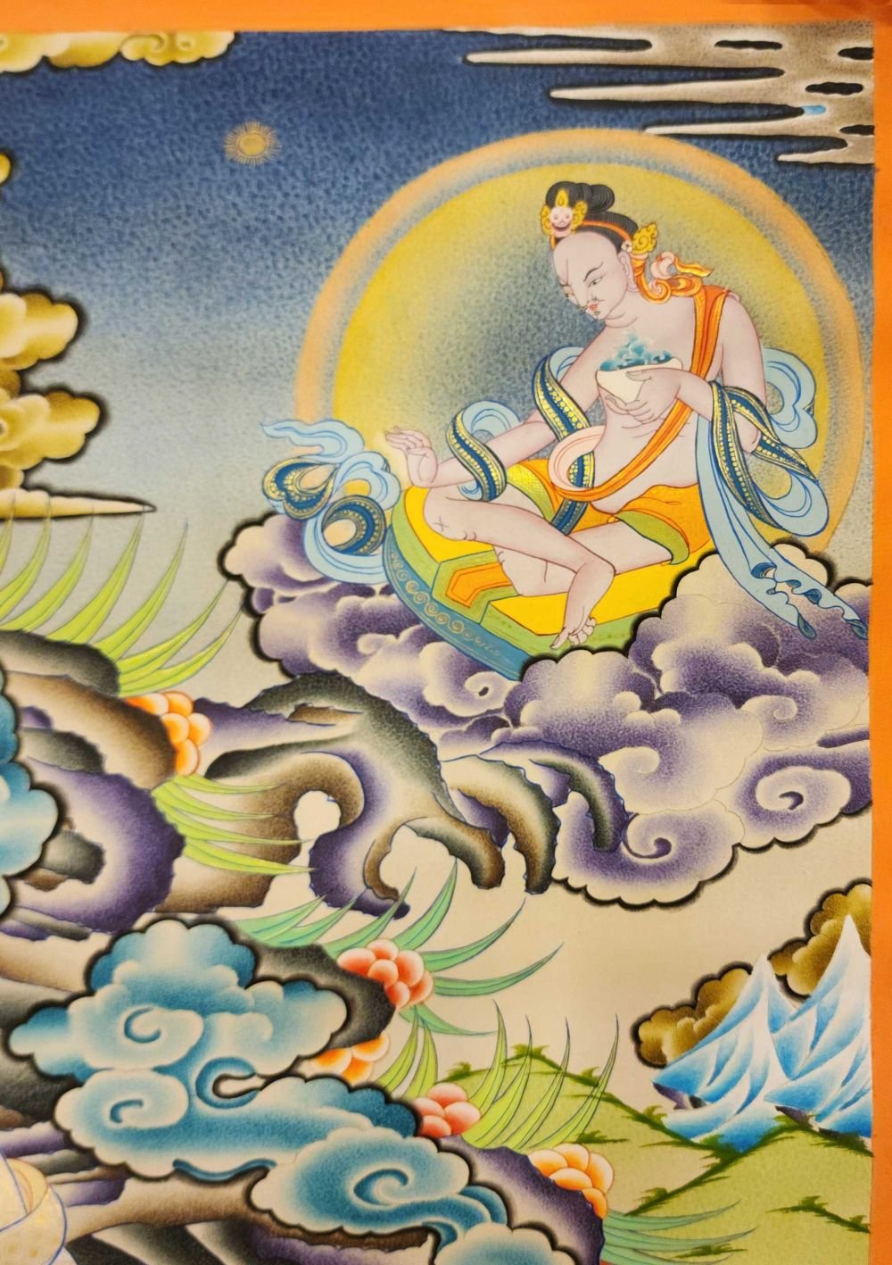This thangka of Milarepa has real gold painted on its surface along with other paints. This is an ancient process of decorating the thangka in Tibetan Buddhism, Here gold is ground into gold dust, which is then mixed with other undisclosed material to make it paintable on the canvas. this mixture is then mixed with transparent glue and painted on the thangka. Read More