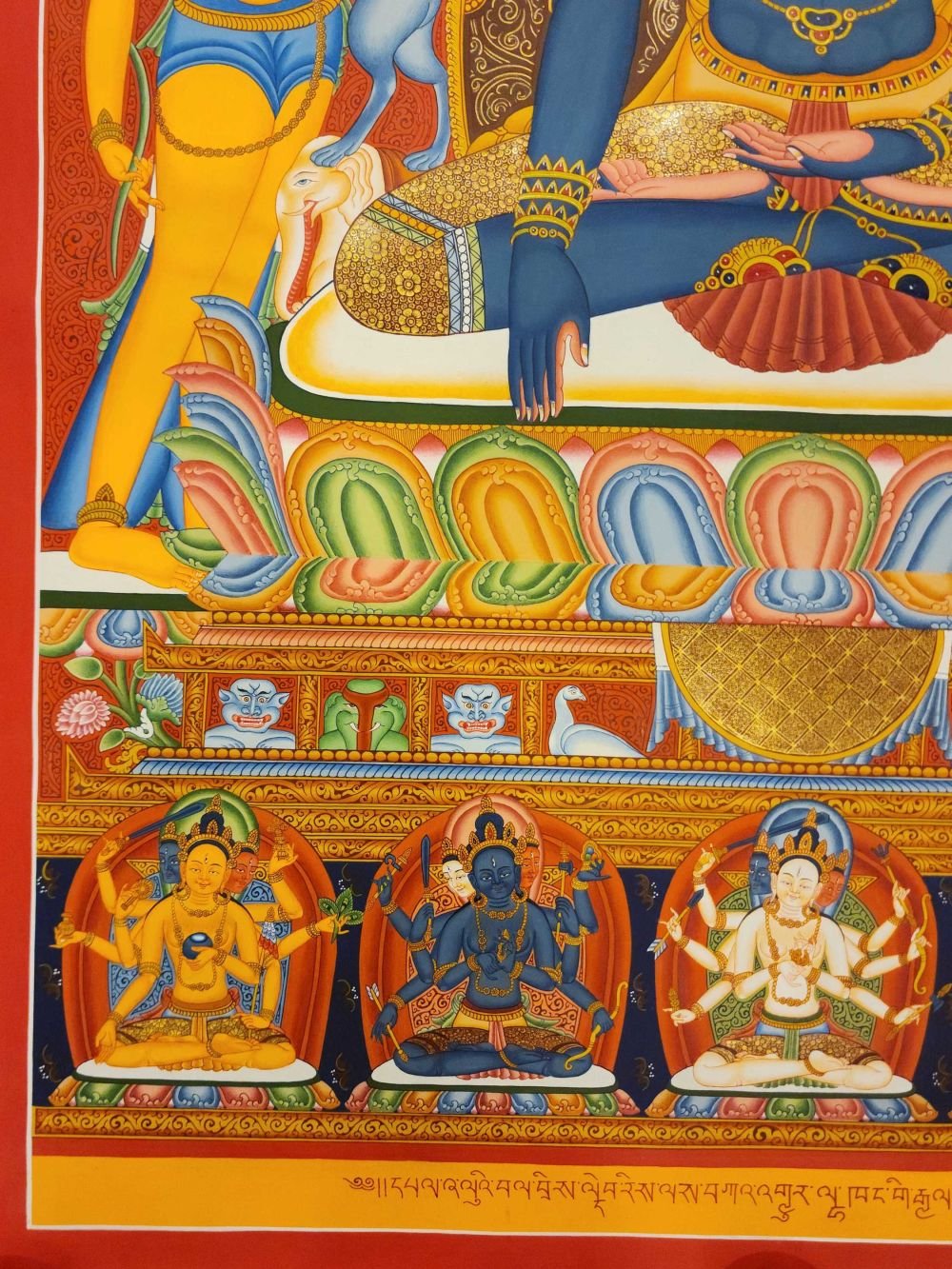 This thangka of Akshobhya Buddha has real gold painted on its surface along with other paints. This is an ancient process of decorating the thangka in Tibetan Buddhism, Here gold is ground into gold dust, which is then mixed with other undisclosed material to make it paintable on the canvas. this mixture is then mixed with transparent glue and painted on the thangka. Read More