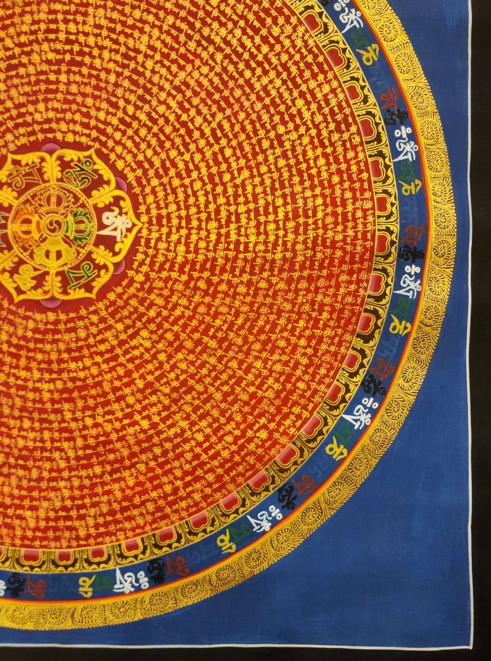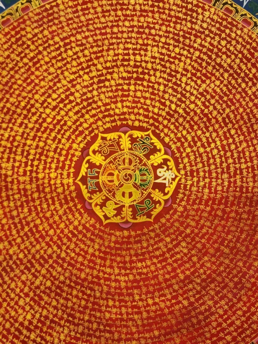 OM MANI PADME HUM is also inscribed in Mandala paintings. Those kinds of mandala have OM MANI PADME HUM in a circular fashion, and mantras are painted in concentric circles from the surface to the center of the circle. They come under the categories of the Mantra Mandala. These mandalas are usually found hanging on the walls of Buddhist monasteries and are often used in meditation halls for focus and concentration purposes.