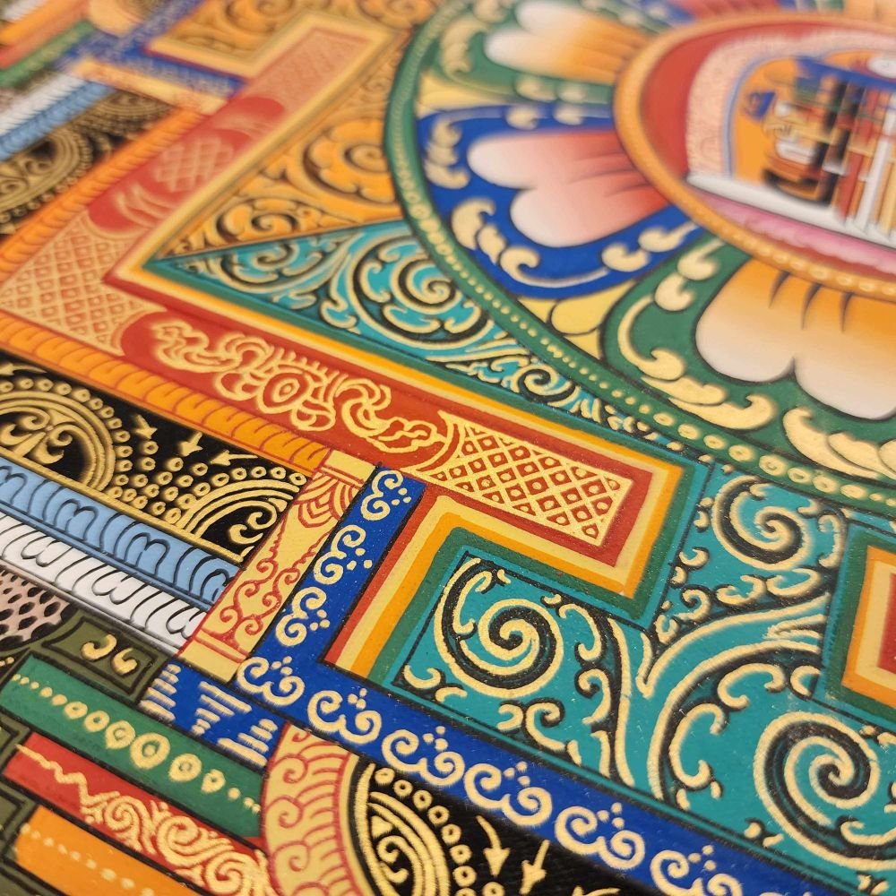 Mandala Thangka painting is a revered form of sacred art in Buddhism, characterized by intricate and vibrant depictions on cotton or silk. These paintings often feature a central deity or Buddha figure surrounded by meticulously crafted symmetrical patterns, geometric designs, and symbolic elements. Mandala Thangkas serve as visual aids for meditation and spiritual growth, guiding practitioners towards inner peace, harmony, and enlightenment. Through their precise brushwork and rich symbolism, these artworks invite viewers to contemplate the profound spiritual journey within themselves, fostering mindfulness, concentration, and a deeper connection with the universal truths of Buddhism. Read More