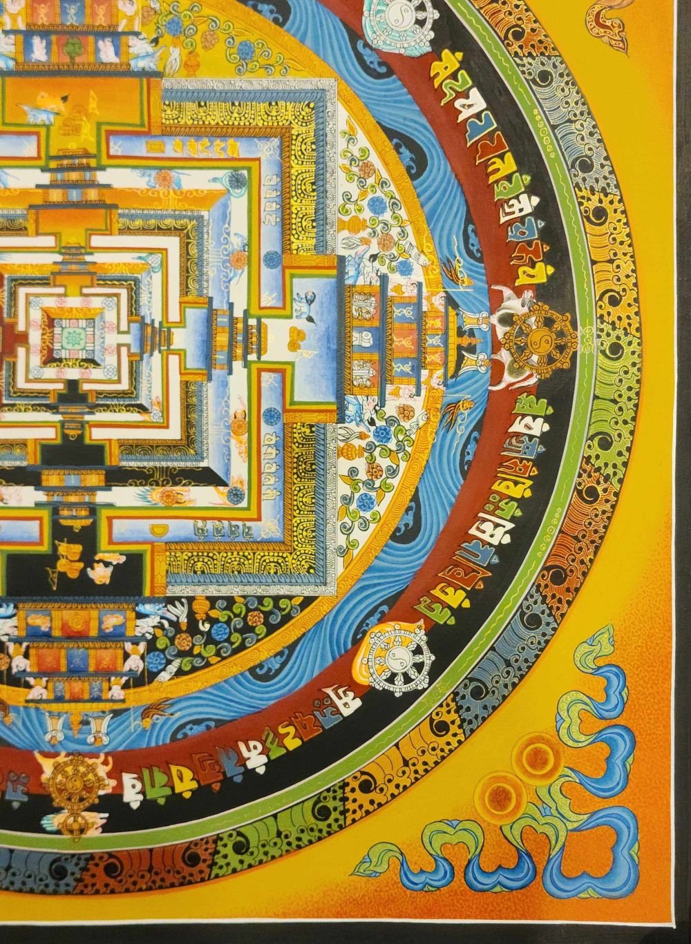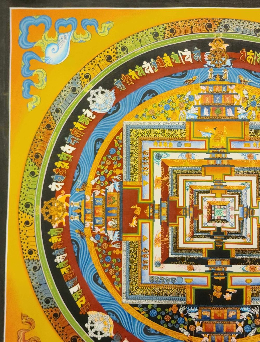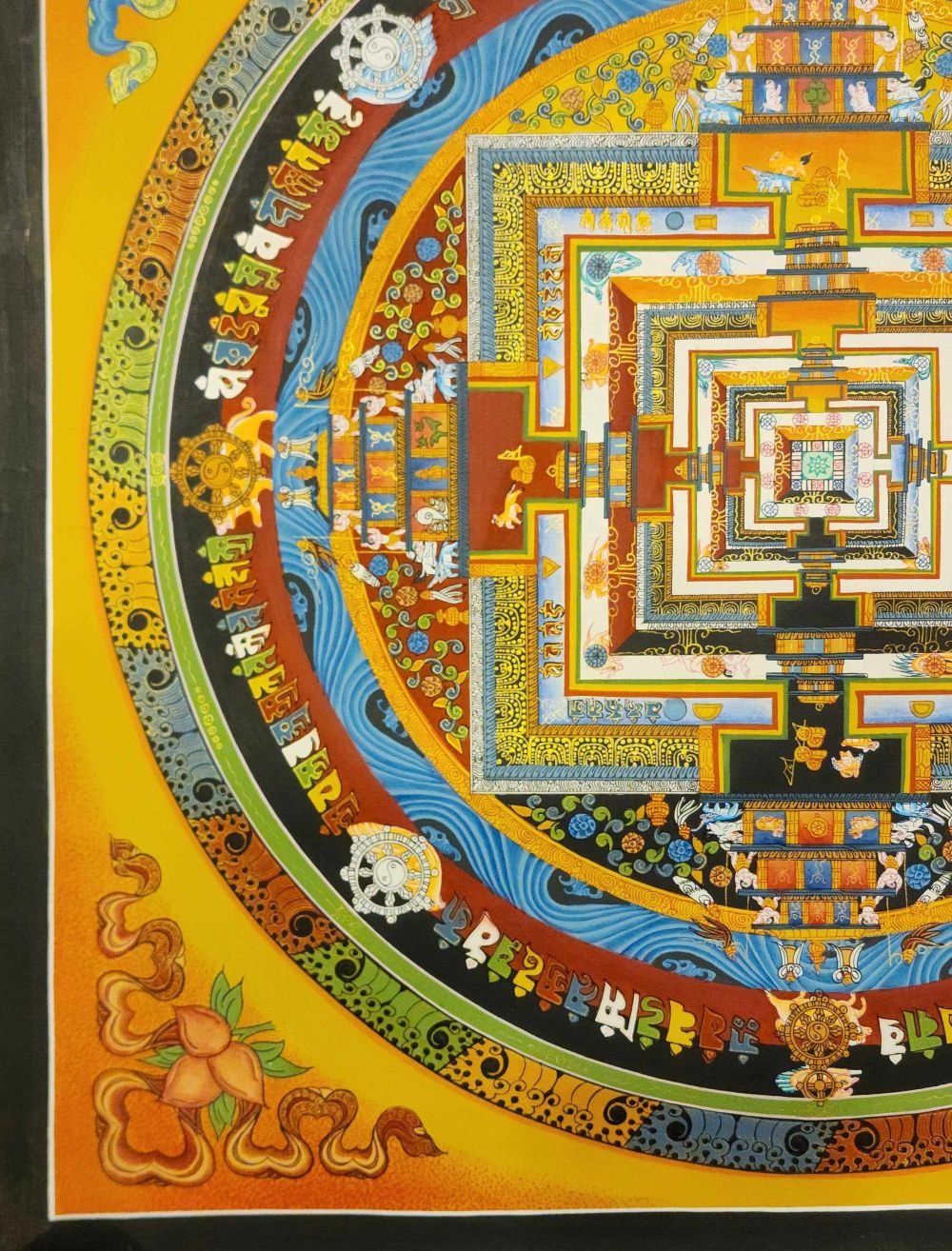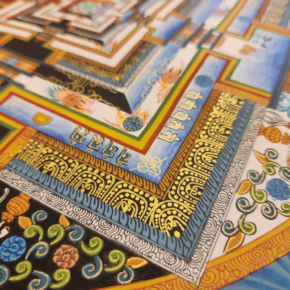 Although depicted here on a flat surface, the mandala is actually three-dimensional, being a five-storeyed "divine mansion", at the centre of which stands the Kalachakra deity the manifest state of Enlightenment.