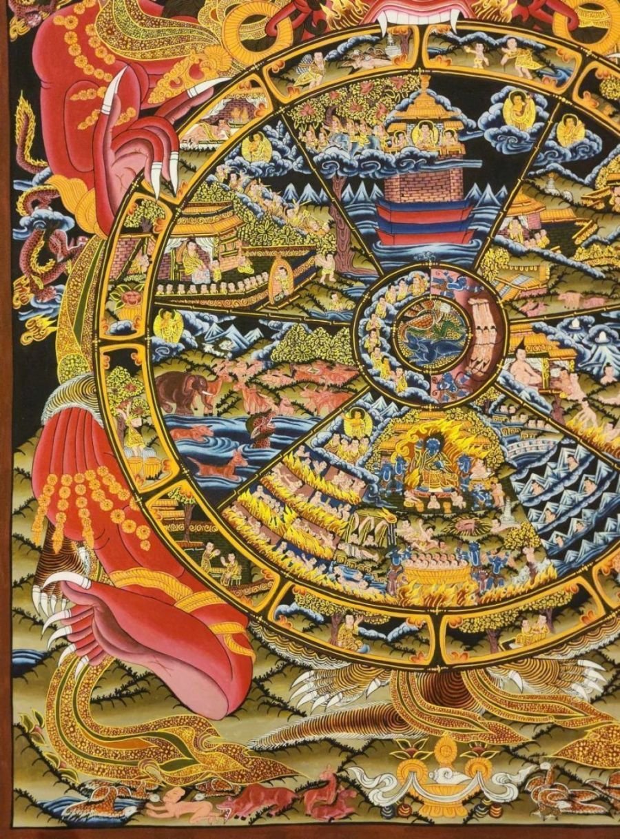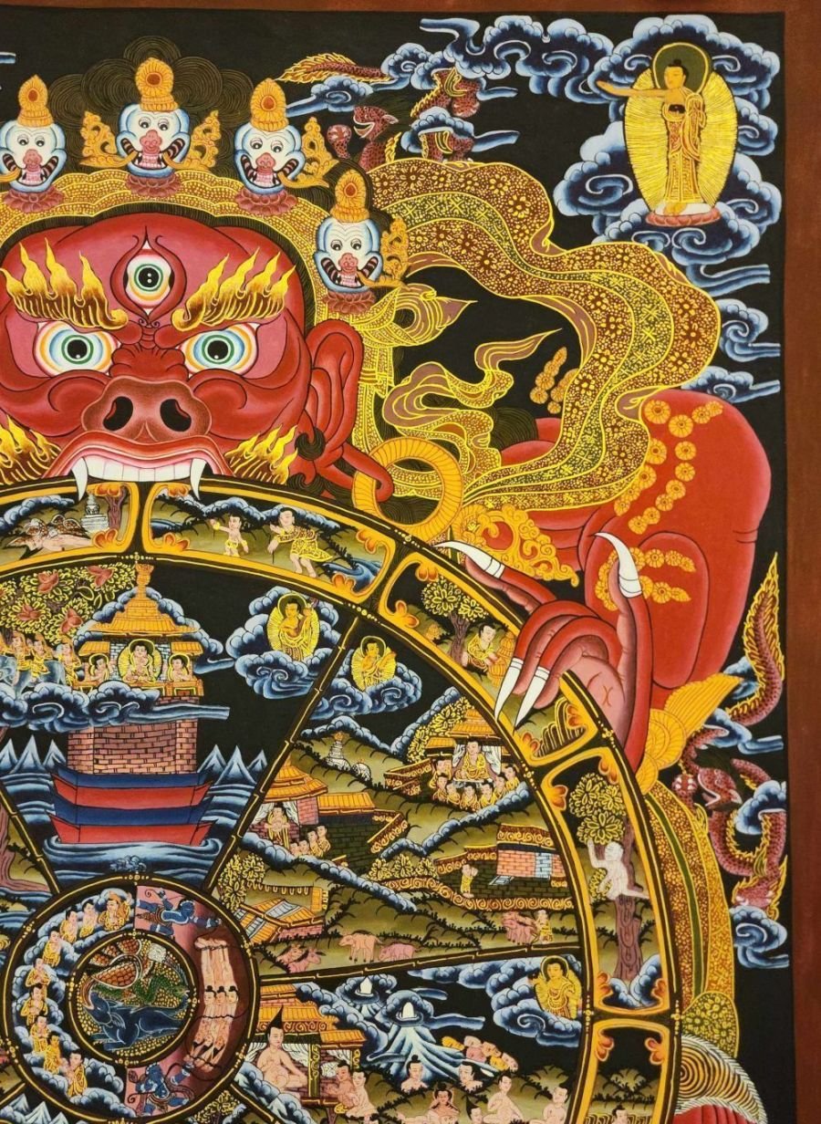 The wheel is being held by a fearsome figure who represents impermanence. The Dalai Lama states:
