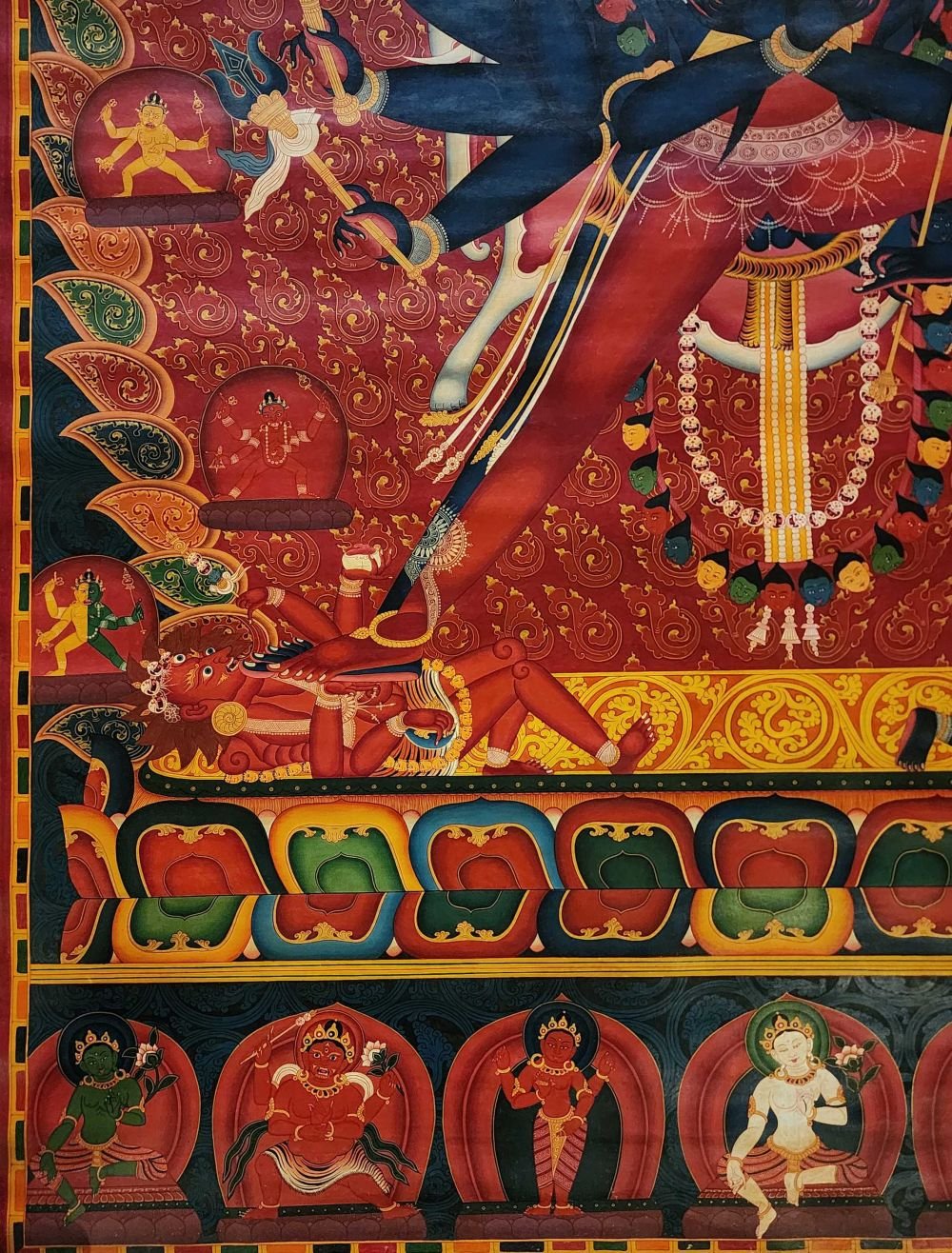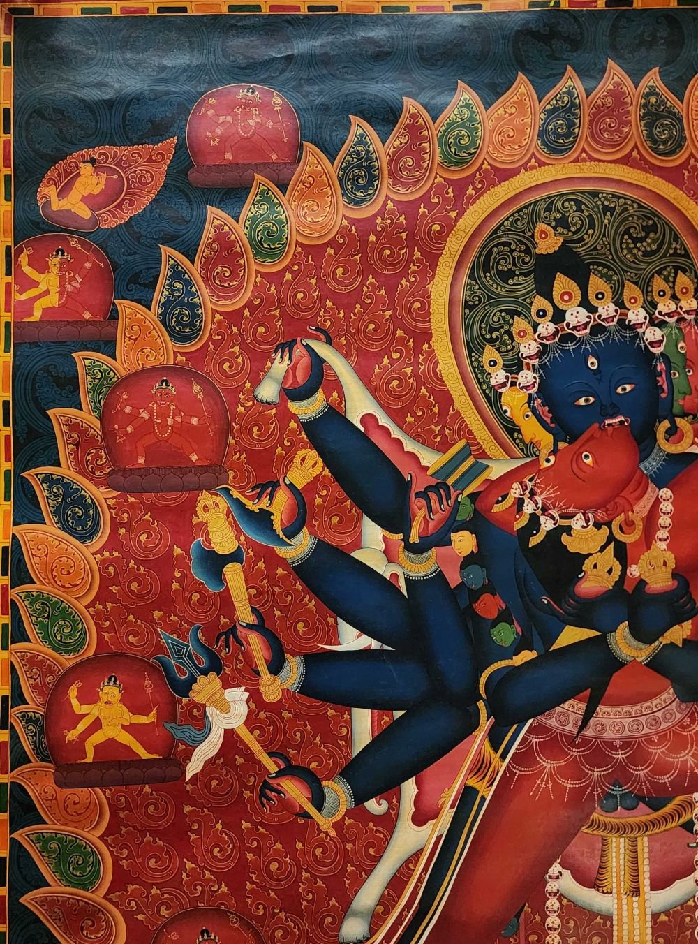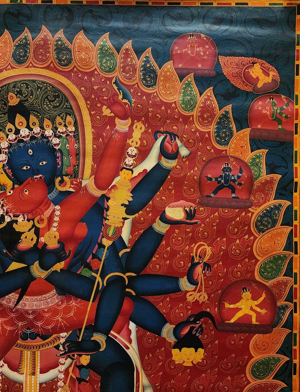 Chakrasamvara is represented with a blue body, four faces and twelve arms in yib-yum union with his swisdom energy Vajravarahi {also known as Vajrayogini}. She holds a skullcap in her left hand behind his back and a vajra headed chopper in her right. The chakra referred to is the chakra of Supreme Bliss. Chakrasamvara is regarded as the most important meditational deity [Yidam] of Vajrayana Buddhism, & primary Yidam of the Kagyu tradition with its origin in the meditation of the eighty four Mahasiddhis of India.