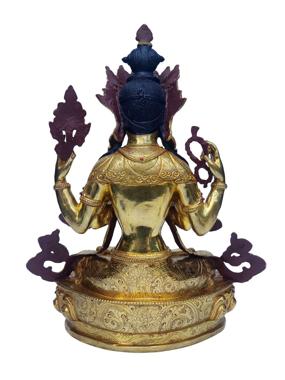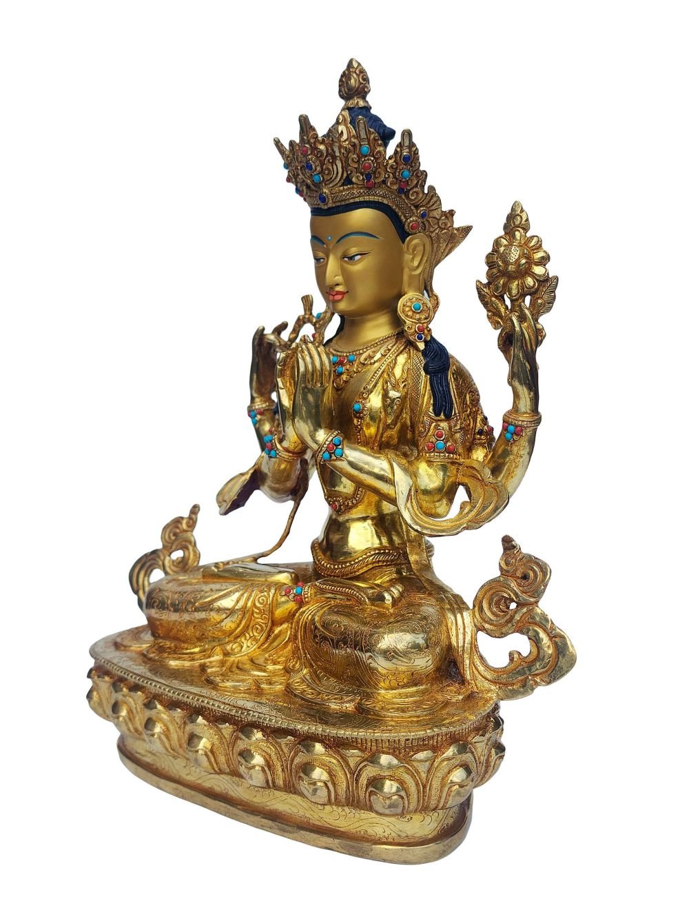 This Chenrezig is finished with full gold plating. also known as mercury gold plating or fire gold plating. This traditional technique involves the application of a genuine layer of gold onto the Chenrezig. Referred to as mercury gold plating, it is considered the correct and authentic form of gold plating in Nepal. Despite being more expensive than electroplating, this traditional mercury gold plating is gaining popularity again in Nepal. People are drawn to its authenticity, longevity, and the unmatched beauty it brings to the Chenrezig. The resurgence of interest in this traditional form of gold plating reflects a growing appreciation for the craftsmanship and cultural heritage of Nepal Read More