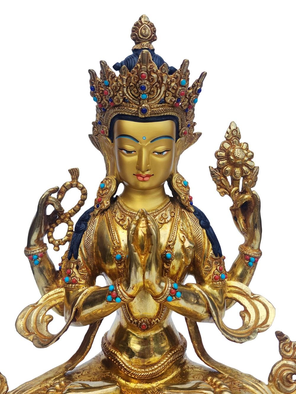 Chenrezig - Avalokitesvara, Buddhist Handmade Statue, Face Painted, Gold Plated , Bodhisattva of Compassion, Protector of All Beings