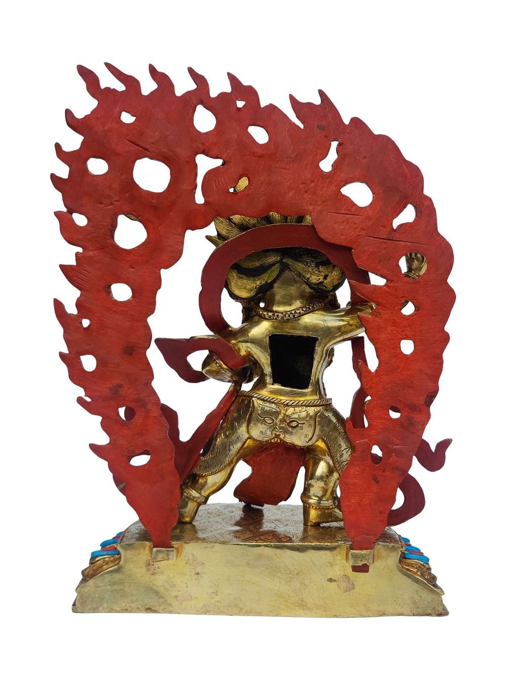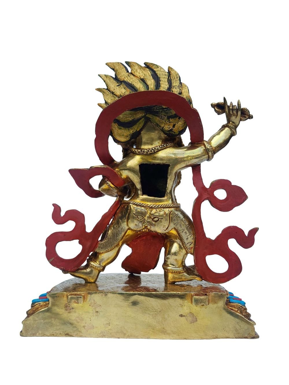 The Vajrapani is adorned with an exquisite array of semi-precious stones, including turquoise, coral, and lapis lazuli. These stones are carefully selected and meticulously placed on the Vajrapani's surface, adding a touch of opulence and enhancing its overall beauty. Each stone is thoughtfully positioned using a high-quality adhesive, ensuring secure and long-lasting attachment. The vibrant colors and unique patterns of the stones create a captivating contrast against the backdrop of the Vajrapani, elevating its visual appeal and making it truly eye-catching. Read More