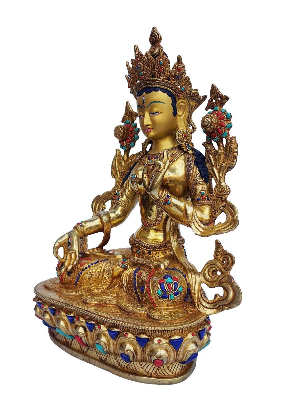 The White Tara is adorned with an exquisite array of semi-precious stones, including turquoise, coral, and lapis lazuli. These stones are carefully selected and meticulously placed on the White Tara's surface, adding a touch of opulence and enhancing its overall beauty. Each stone is thoughtfully positioned using a high-quality adhesive, ensuring secure and long-lasting attachment. The vibrant colors and unique patterns of the stones create a captivating contrast against the backdrop of the White Tara, elevating its visual appeal and making it truly eye-catching. Read More