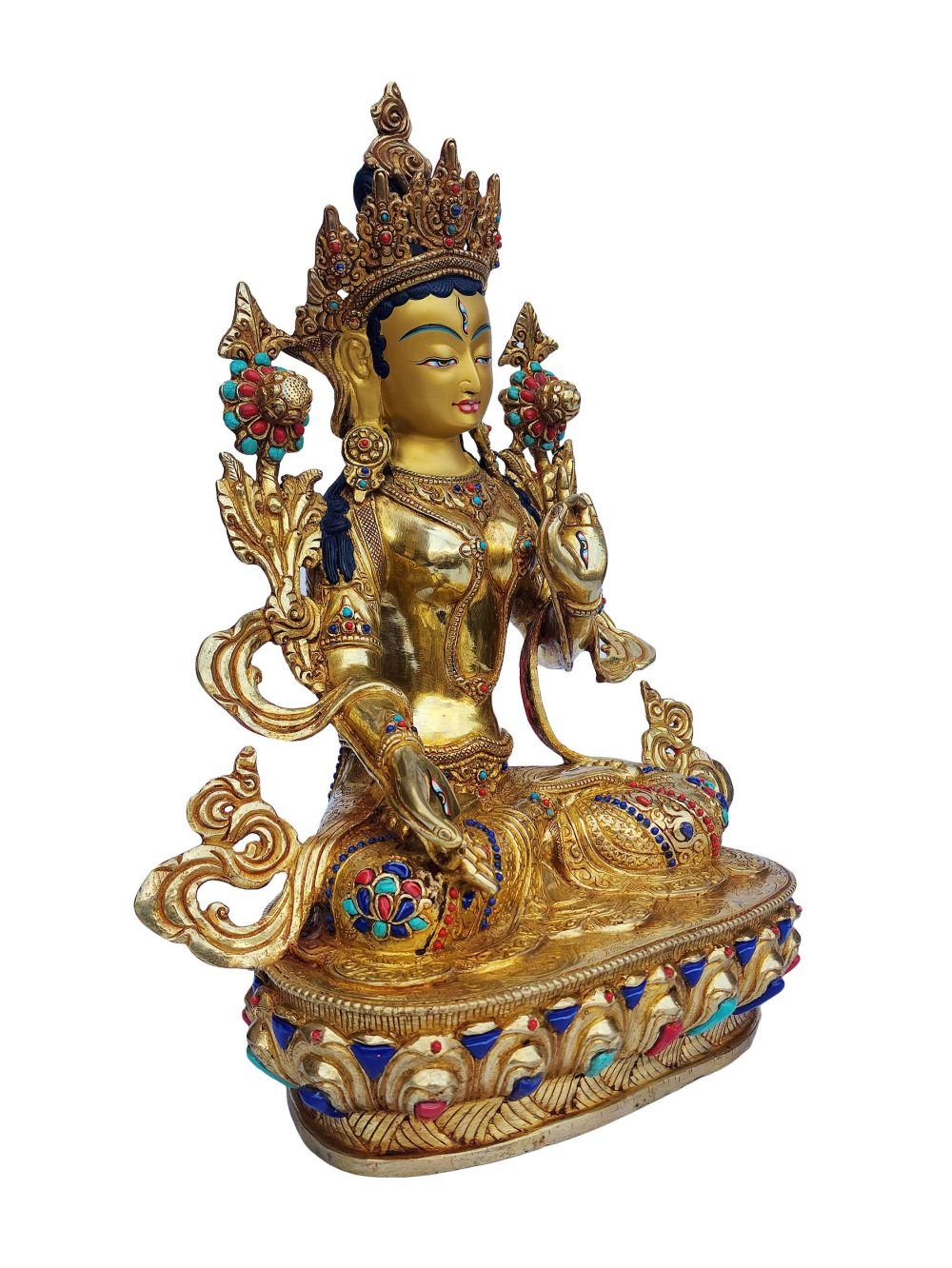 White Tara, Buddhist Handmade Statue, Face Painted, Gold Plated, Stone Setting , Goddess of longevity, healing, and serene compassion
