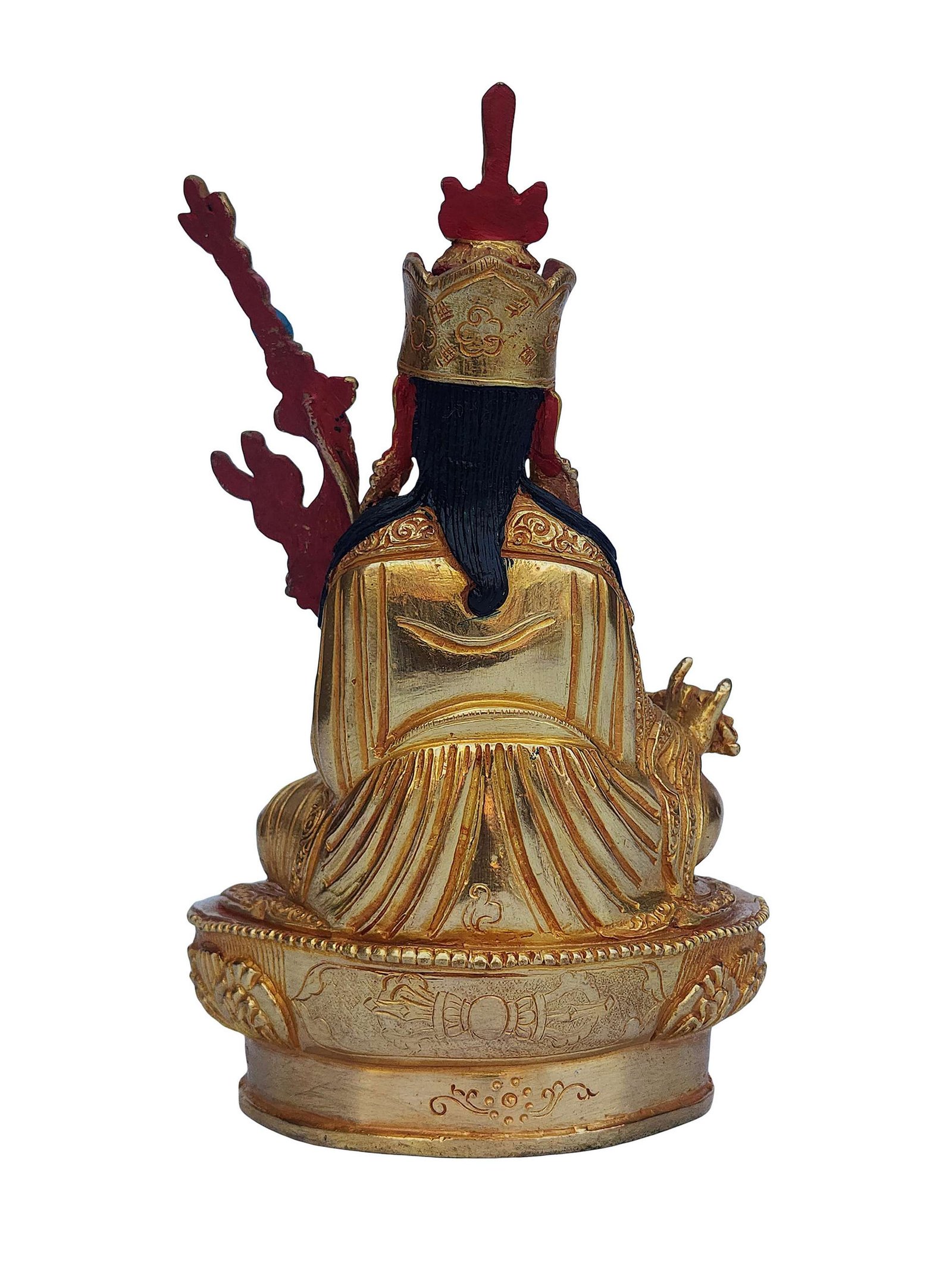 The face of Padmasambhava is painted with gold to enhance its significant features, particularly the eyes, and lips. This detailed painting is essential as it brings forth the crucial attributes of the expression of eyes and lips that metal carving alone cannot capture.