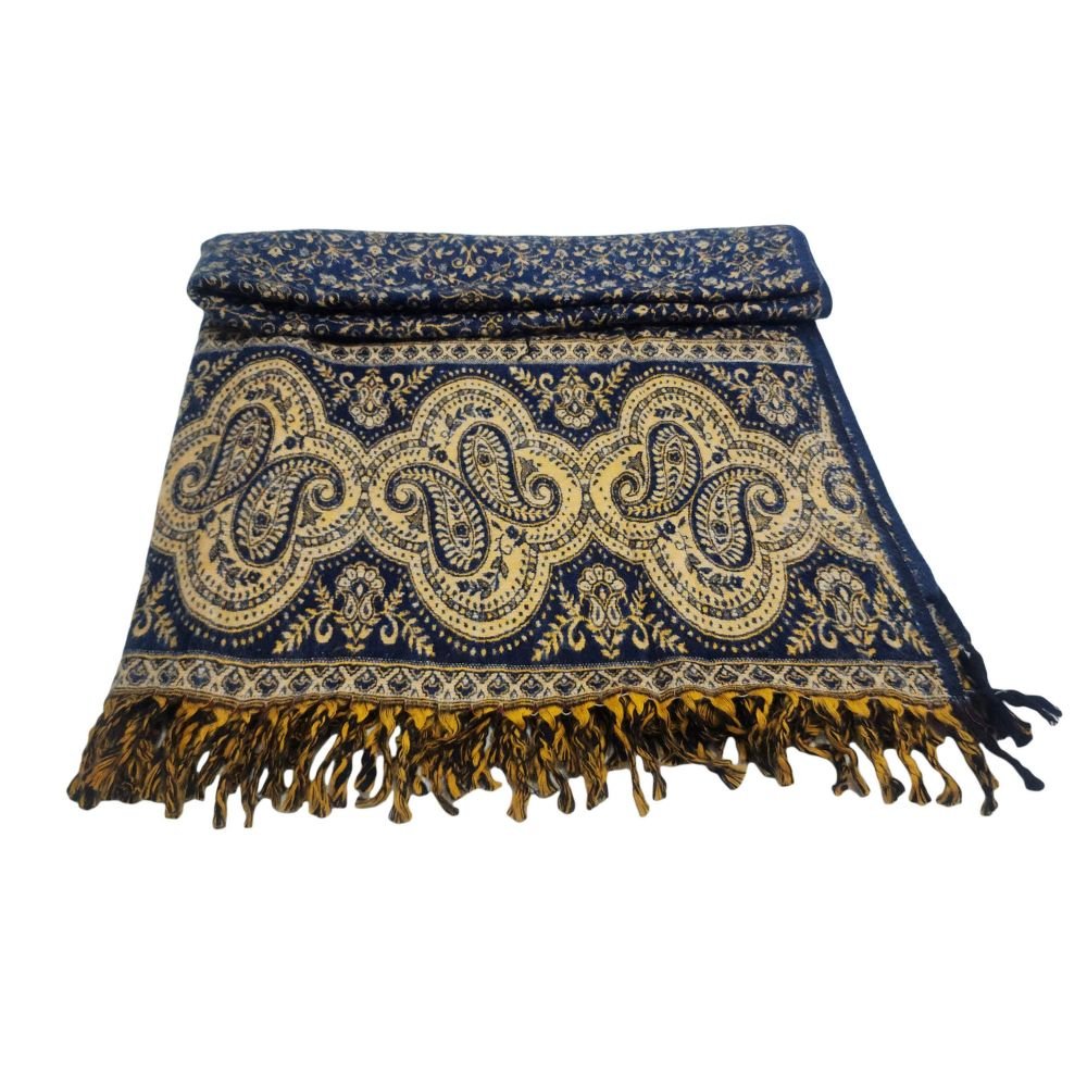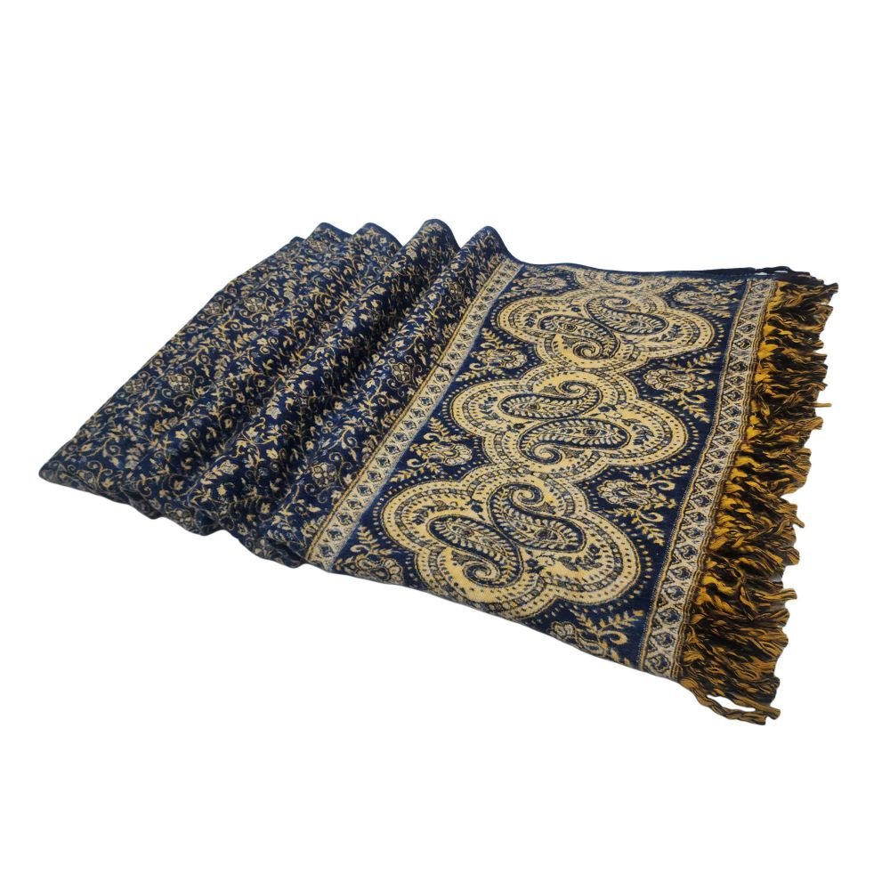 This is an acrylic woolen shawl, also known as the Indian multi-color shawl or Dhaka shawl. These shawls are made from high-quality acrylic wool and feature various eye-catching patterns created on looms. They are not only attractive but also very durable.