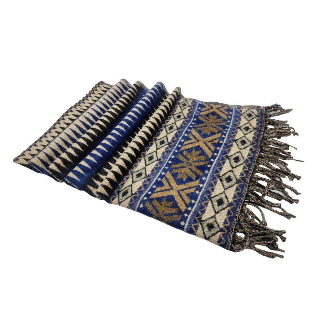 This is an acrylic woolen shawl, also known as the Indian multi-color shawl or Dhaka shawl. These shawls are made from high-quality acrylic wool and feature various eye-catching patterns created on looms. They are not only attractive but also very durable.
