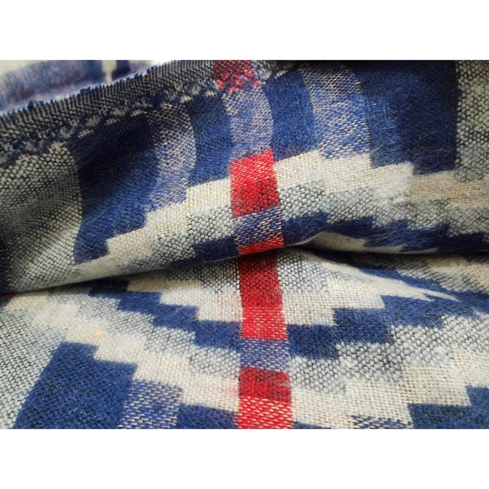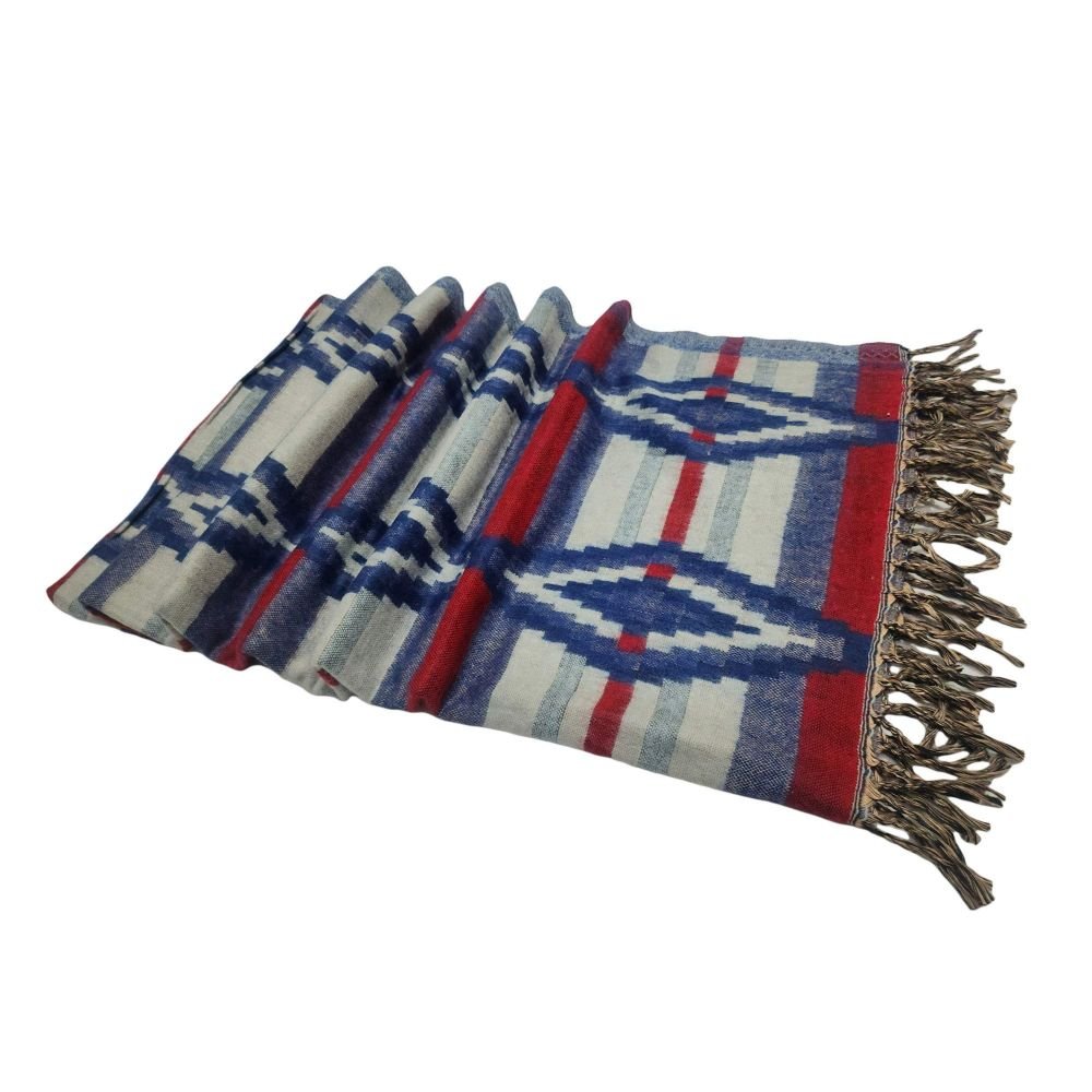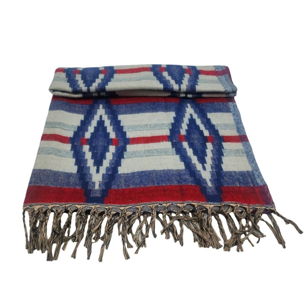 This is an acrylic woolen shawl, also known as the Indian multi-color shawl or Dhaka shawl. These shawls are made from high-quality acrylic wool and feature various eye-catching patterns created on looms. They are not only attractive but also very durable.